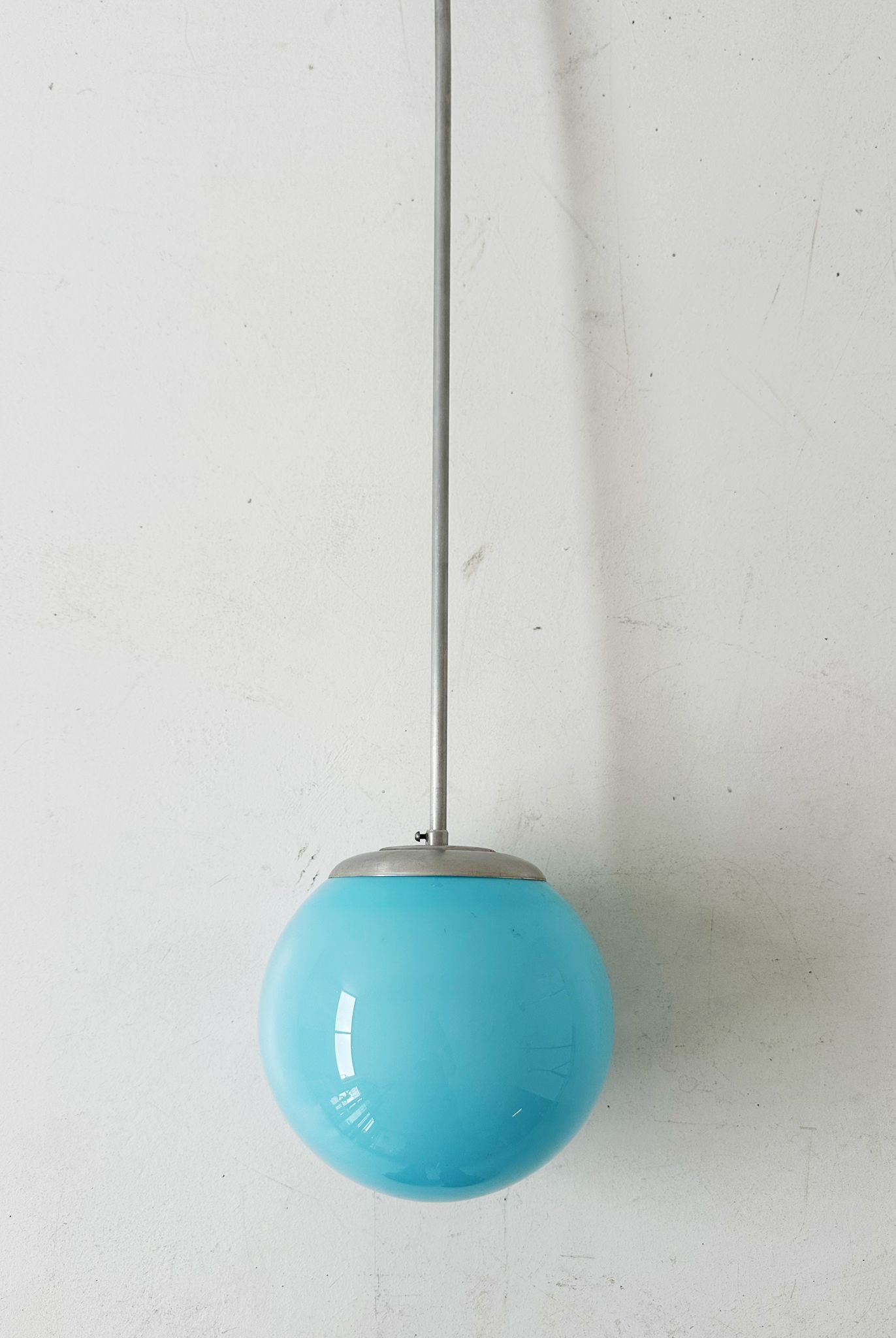 Lampada,1960, struttura in alluminio, sfera in vetro color azzurro