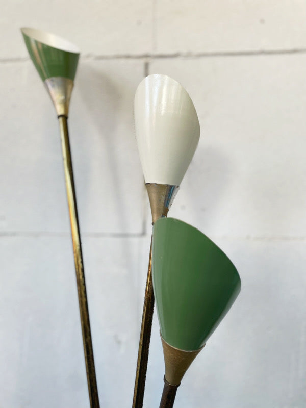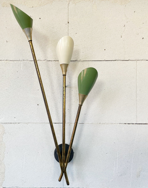 Applique,1960, struttura in ottone, tre lampade in alluminio verde e bianco