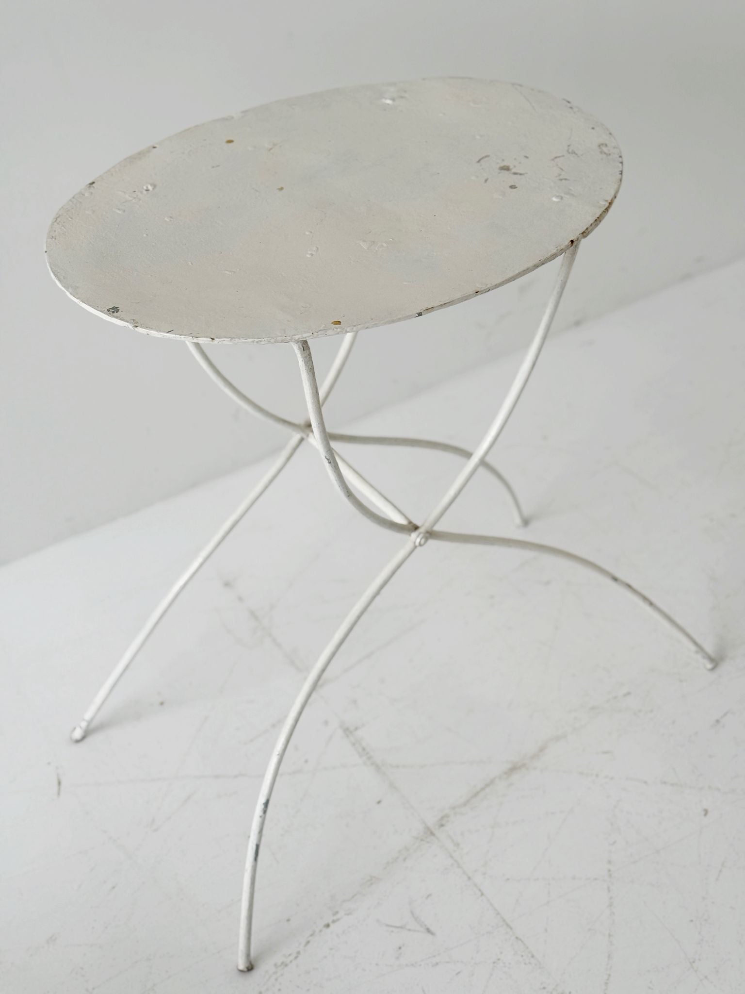 The circular top is supported by a slender frame with crossed arched legs, lending visual lightness and great stability.