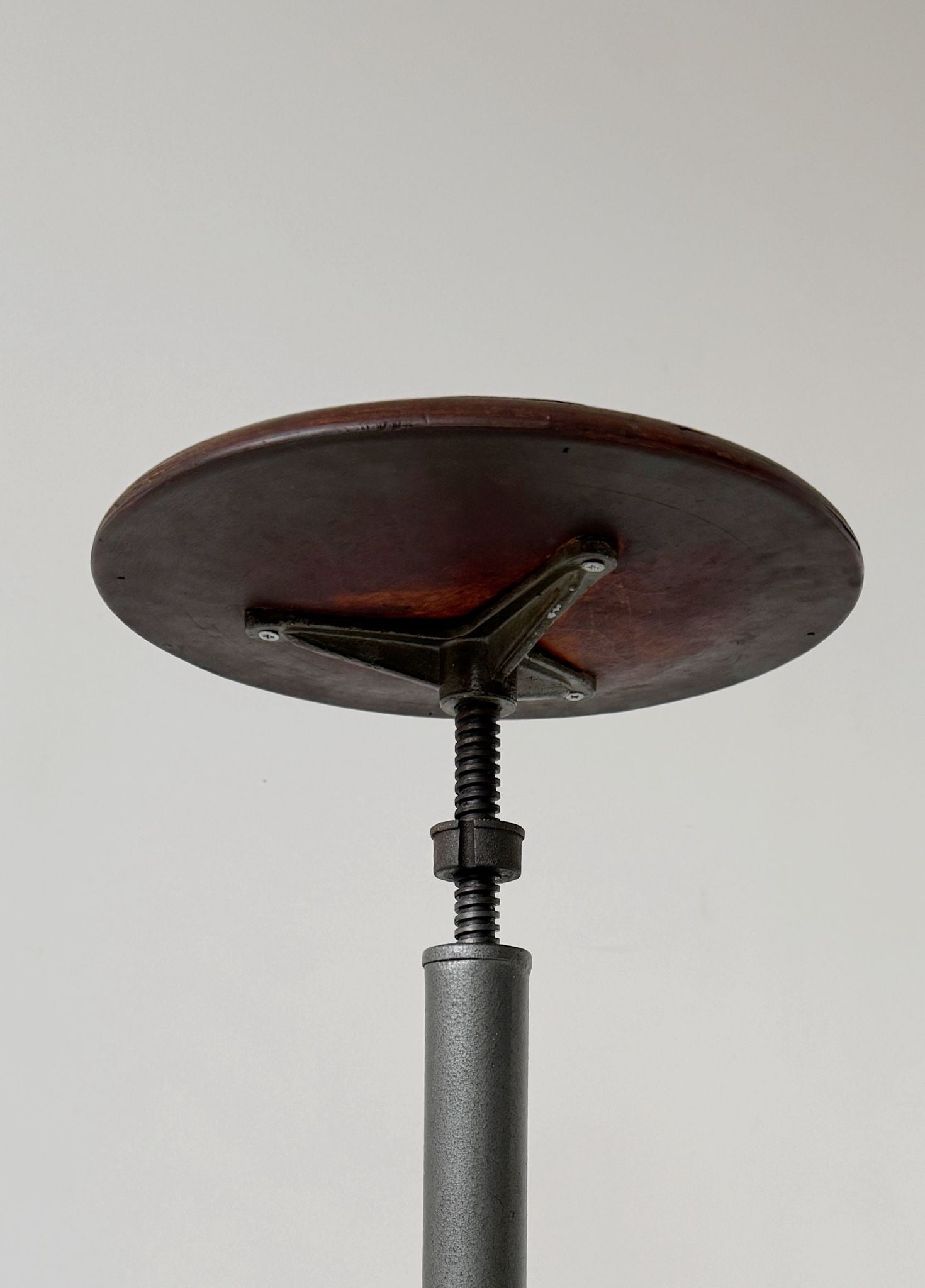 An adjustable industrial stool with a distinctly workshop/laboratory feel, boasting a strong, authentic presence.