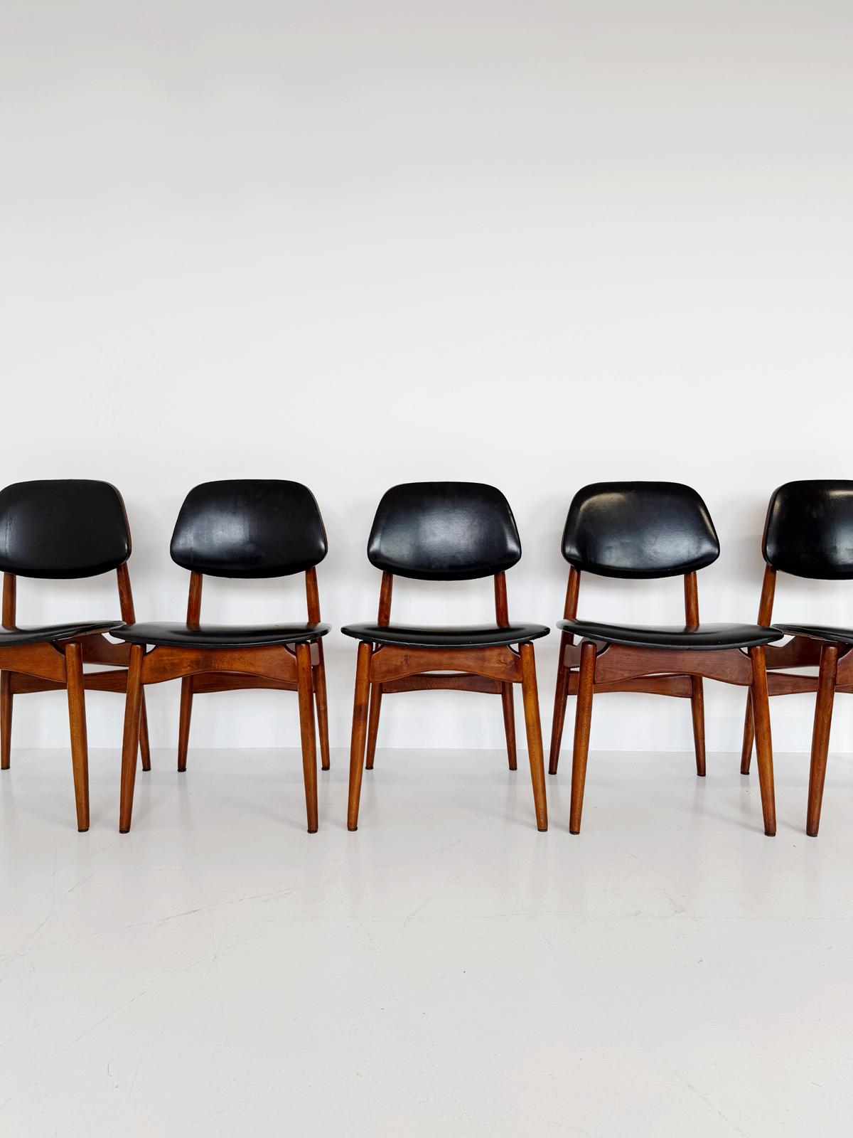 An elegant set of mid-century Scandinavian dining chairs, likely from Denmark in the 1950s or 1960s, featuring the typical combination of a solid teak frame and black upholstery.