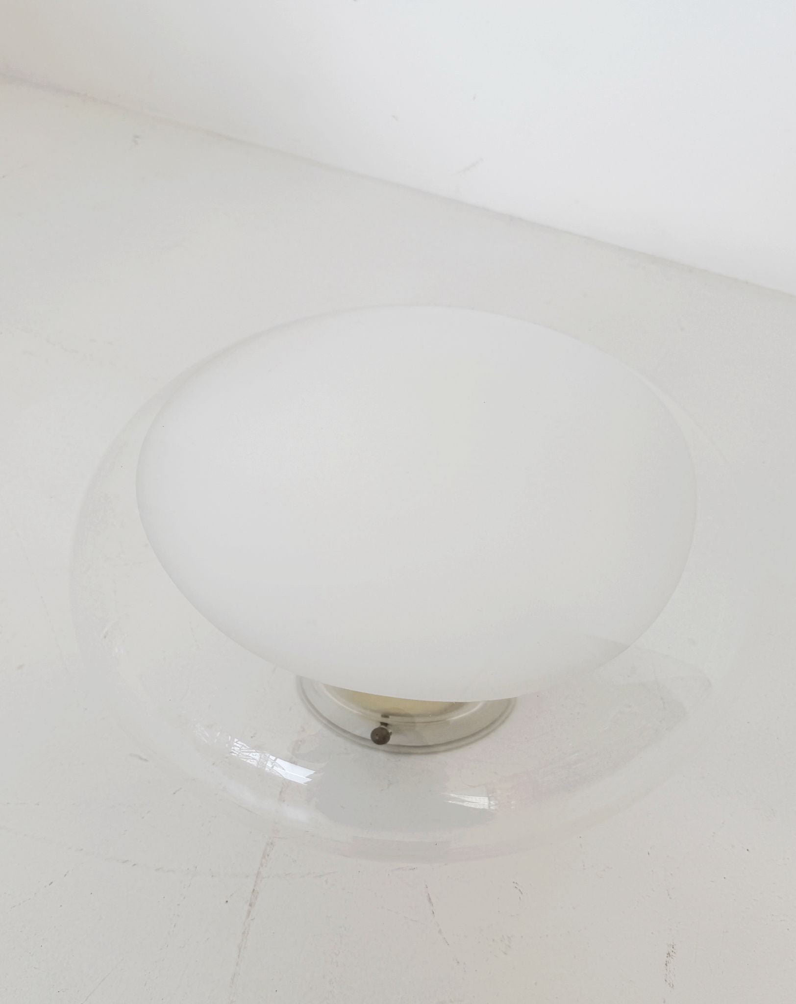 Perfect as a diffused light source in minimalist or modernist environments, it retains the charm of Italian school designs of the period—similar in style to those of Fontana Arte, Veca, or Guzzini.