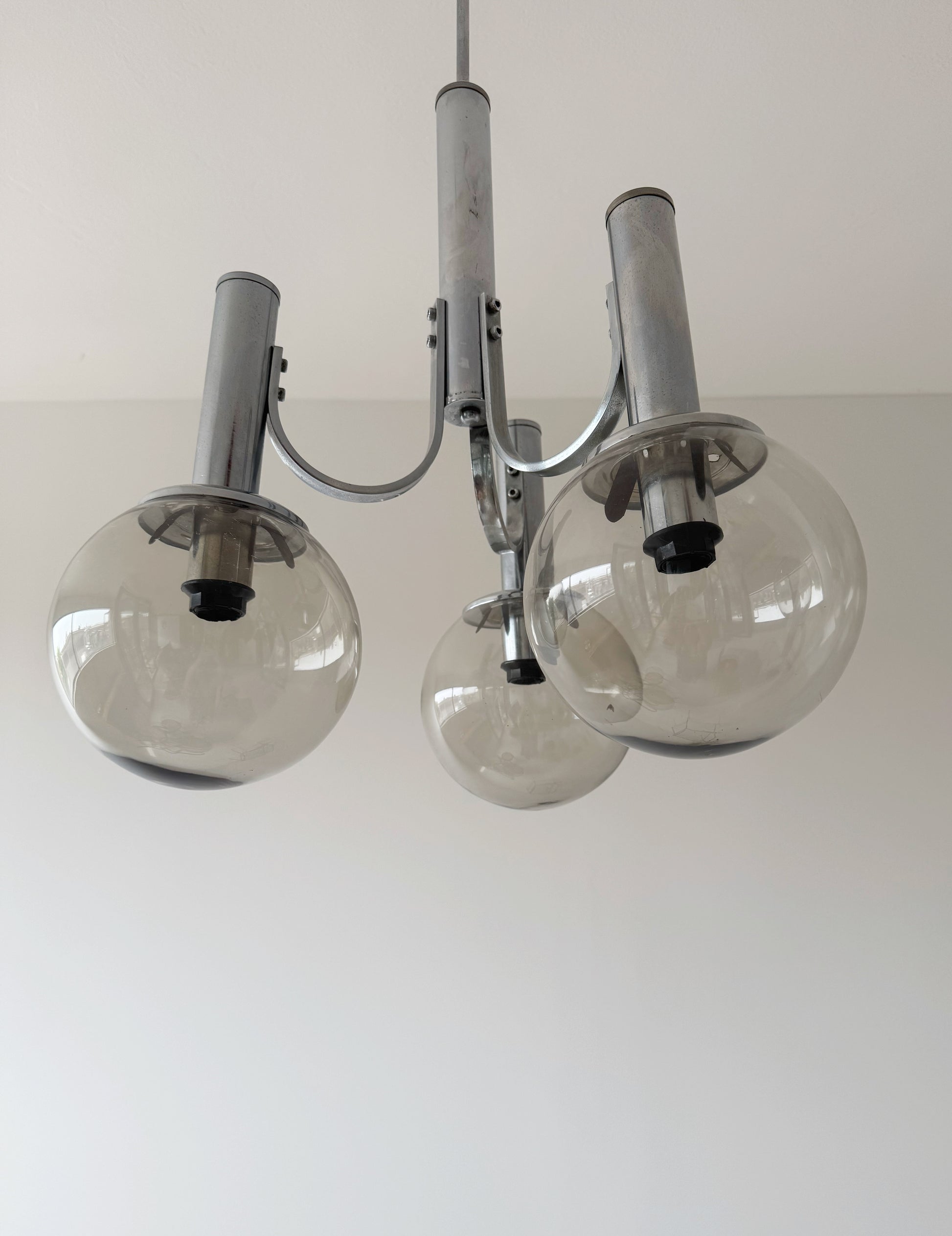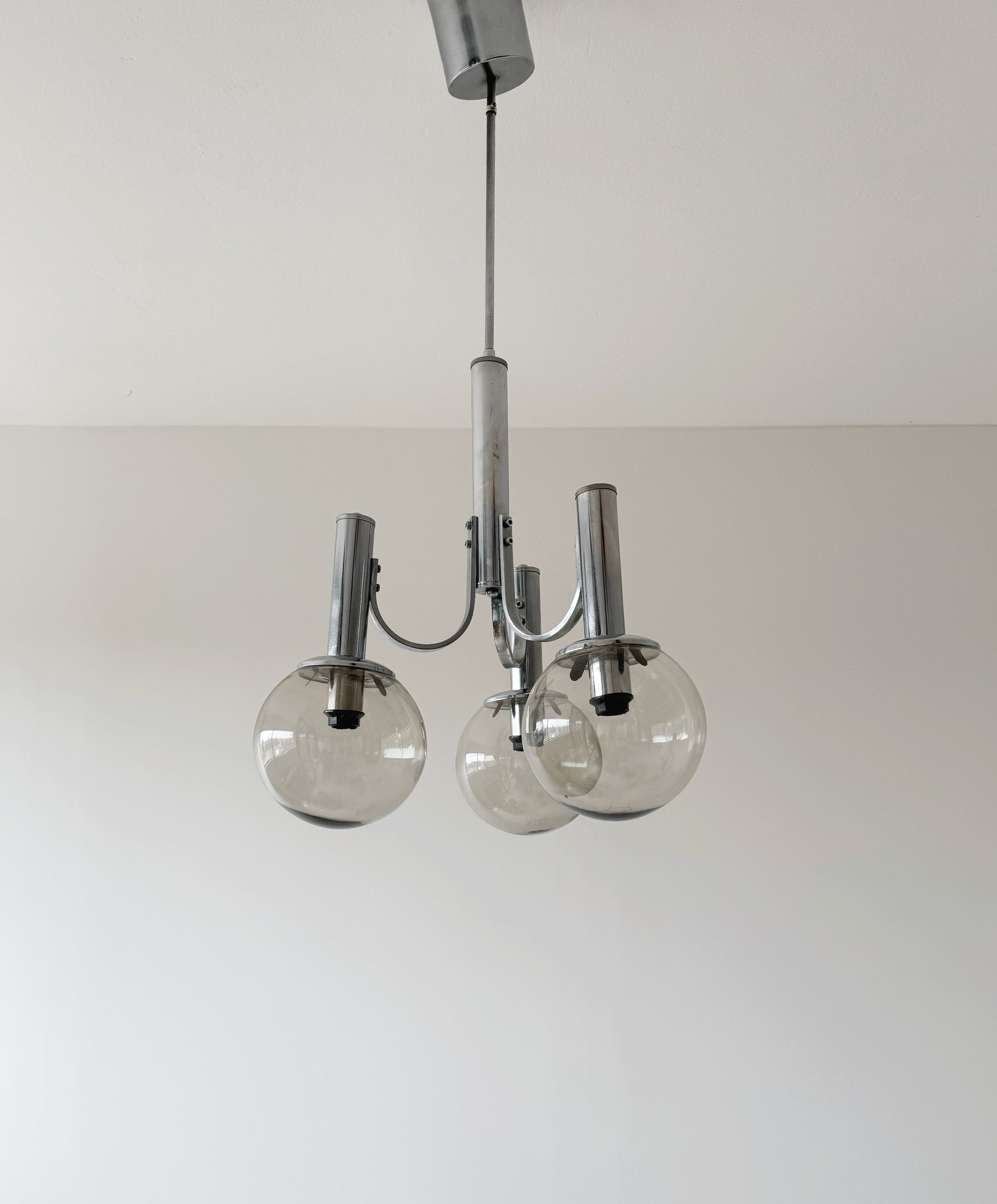 Chandelier,1970s, structure in chrome metal, three lights in trasparent glass sphere