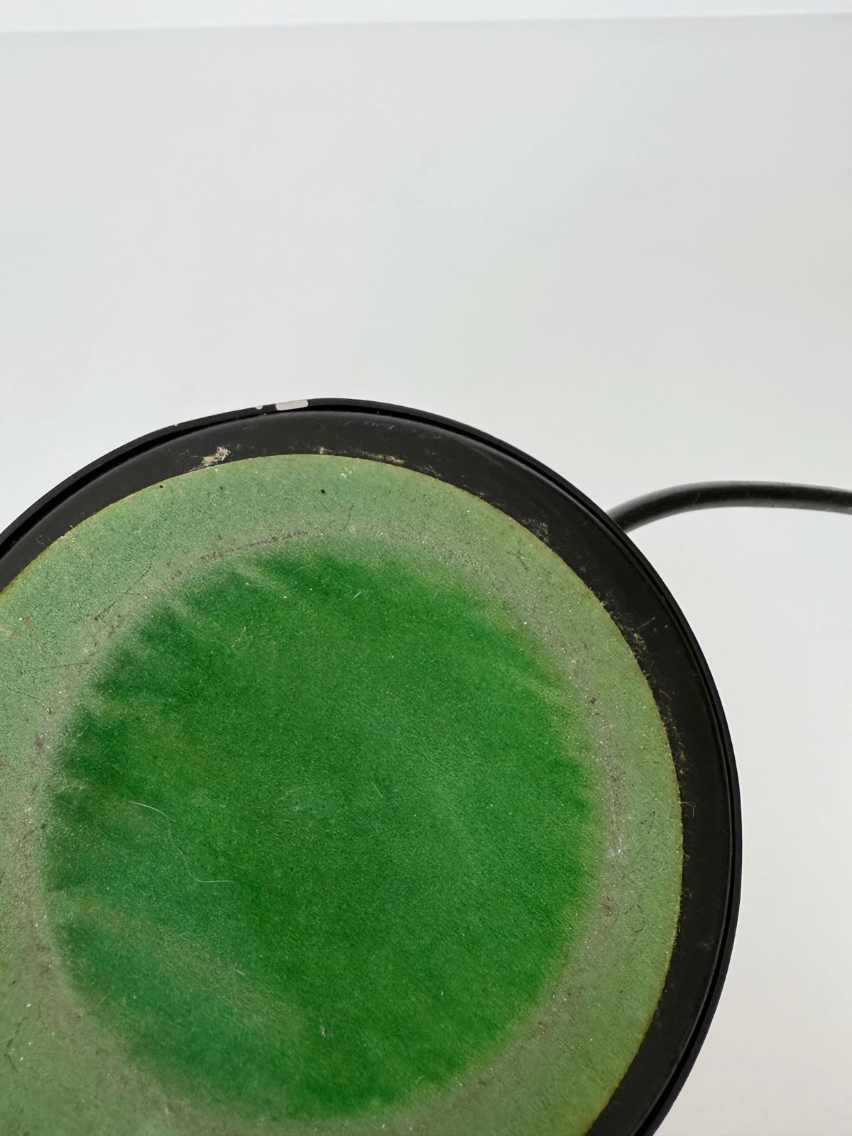 The lamp pictured is an iconic design by Martinelli Luce, called "Elmetto." This lamp is an example of minimalist and futuristic design, featuring a distinctive shape reminiscent of a helmet. The lamp's base is conical and glossy black, with a cable emerging from the bottom. The upper part of the lamp is a black hemisphere, which represents the most interesting part of the design, lending it a sculptural and modern look.