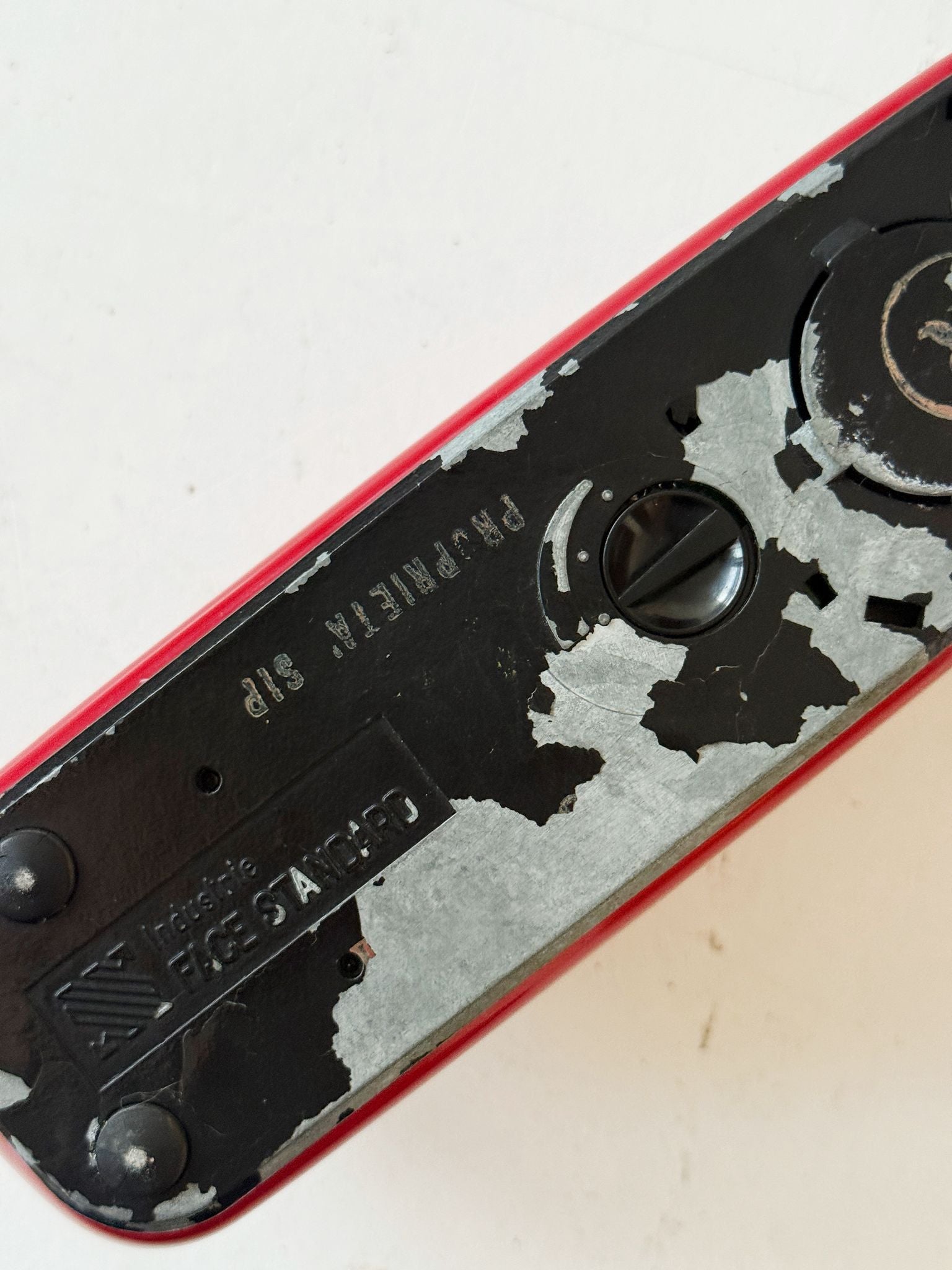 Compact red plastic body with a keypad integrated into the handset, a typical minimalist design of Italian modernism.