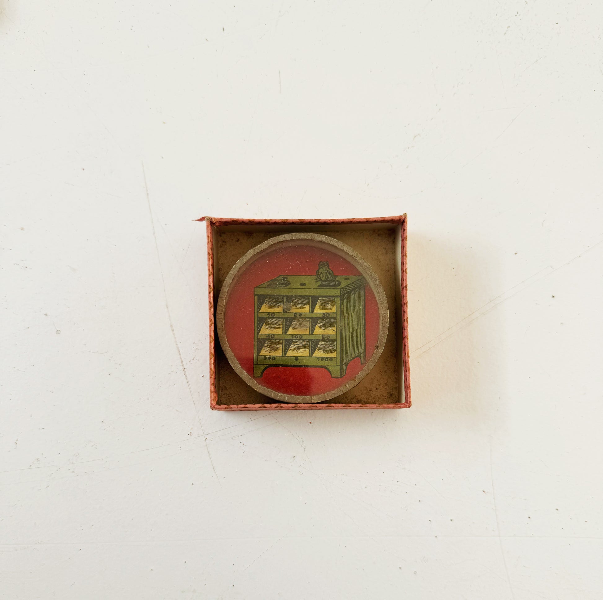 The box, original from the era, shows signs of age: a crease on one corner, a small tear on the edge of the lid, and the printed paper is slightly faded by the sun. Despite this, it still retains its vintage charm, with its retro graphic style and slightly worn French lettering.