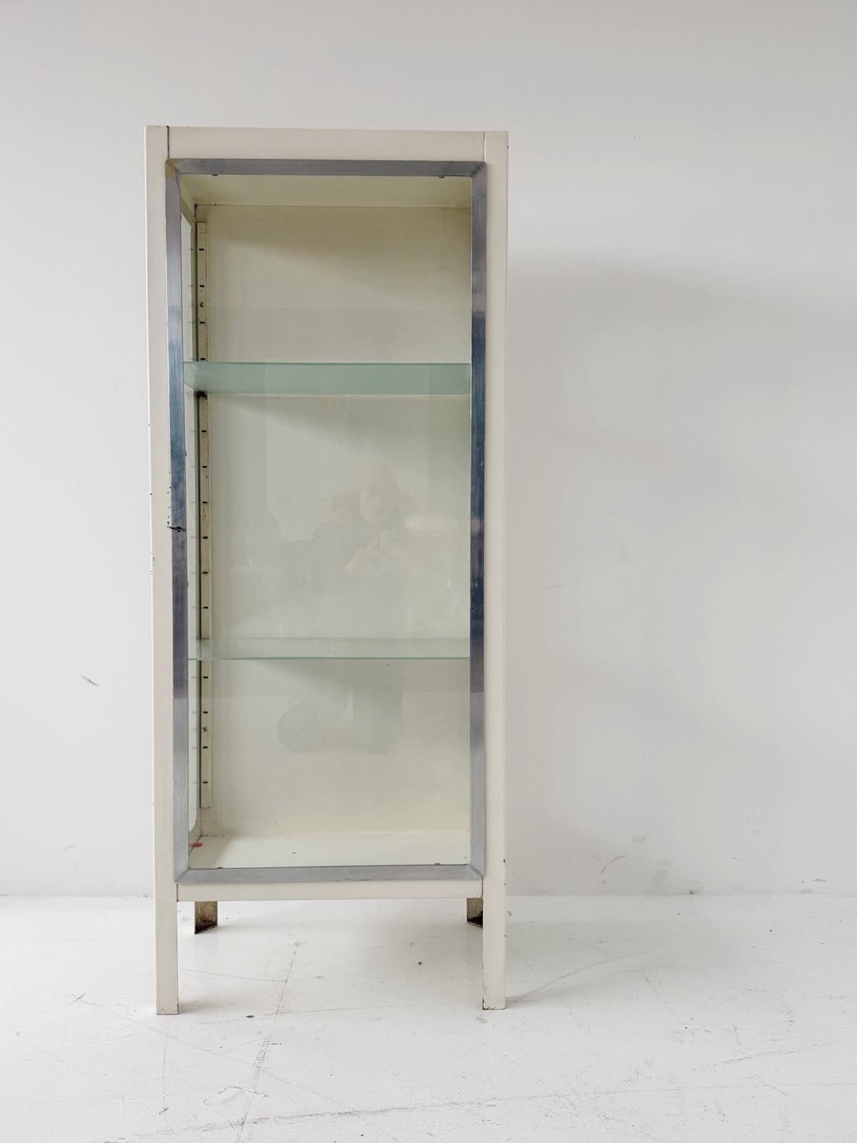 A tall display cabinet inspired by vintage nursing and medical furniture, featuring a light-painted metal frame with signs of wear and an original patina, evidence of its use in healthcare settings.