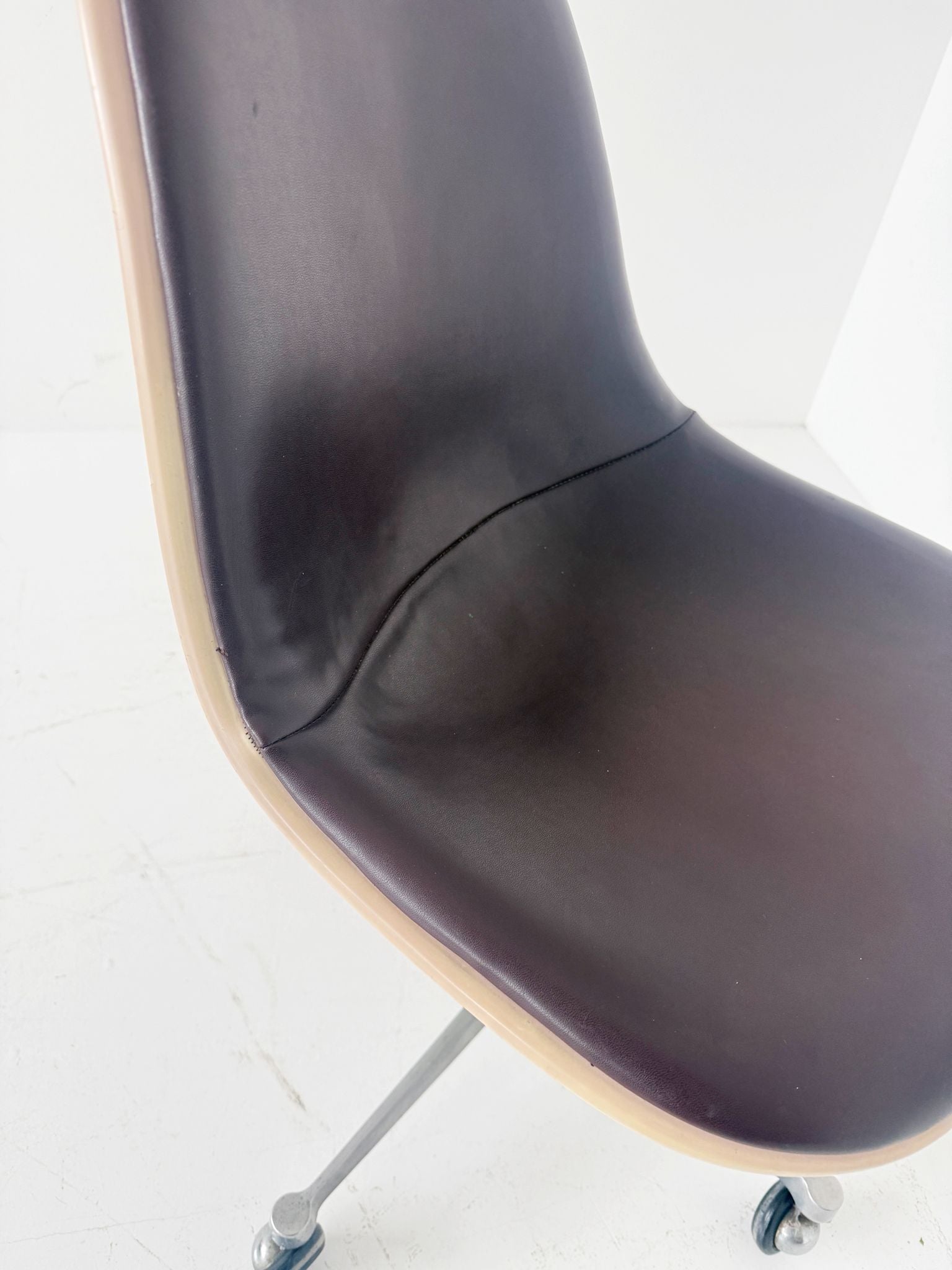 This Italian-made office chair dates back to the 1960s, featuring an ivory-colored fiberglass shell with an attached padded seat and a four-star die-cast aluminum base. The height adjustment is via a screw mechanism, a typical feature of task chairs of the period. Structure with wheels