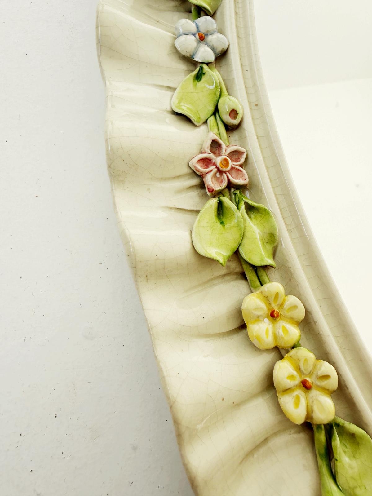 Oval glazed ceramic mirror with a pleated frame and embossed floral decoration, hand-painted in delicate pastel shades. The surface features a light craquelure that enhances its vintage character.