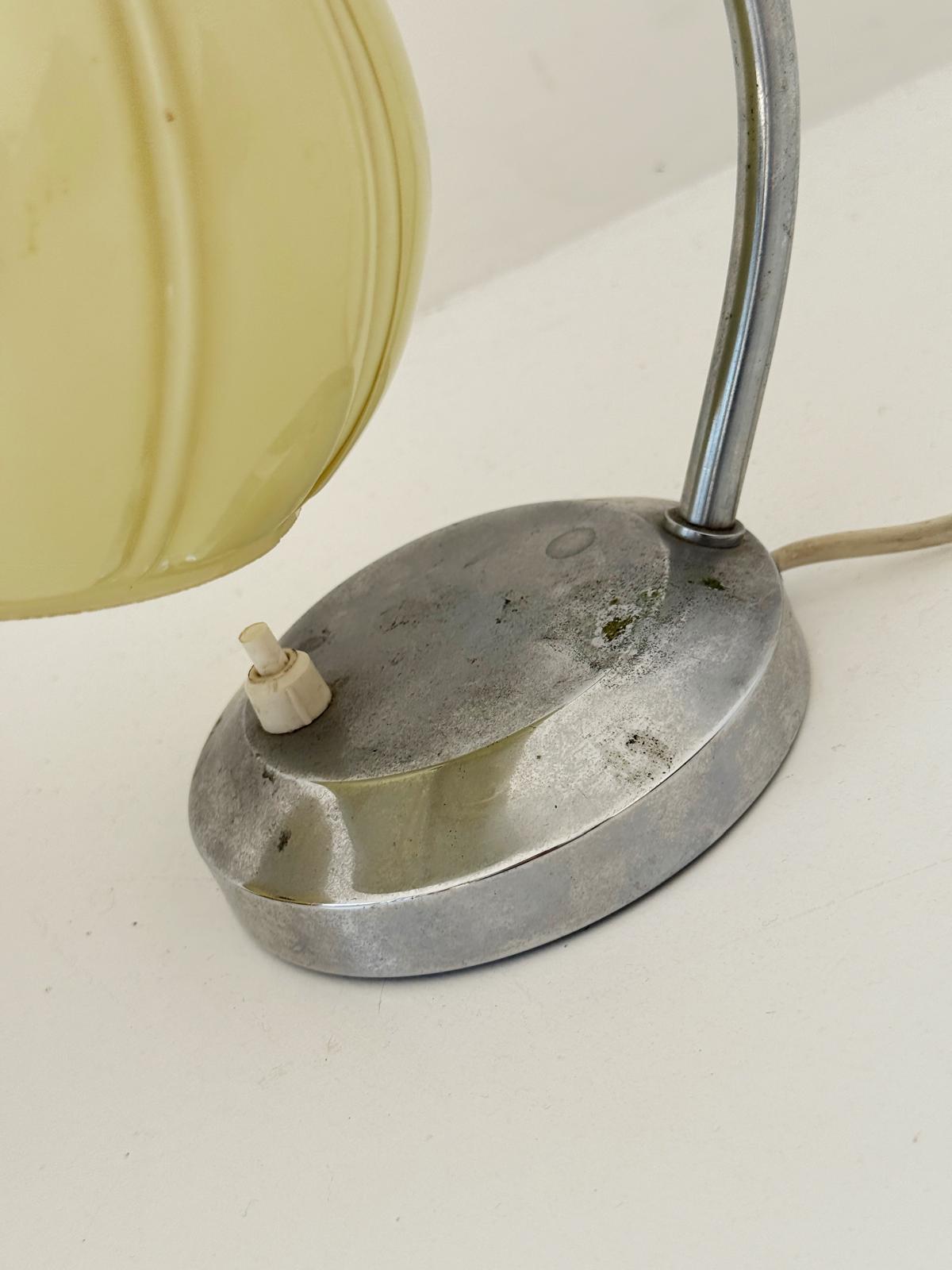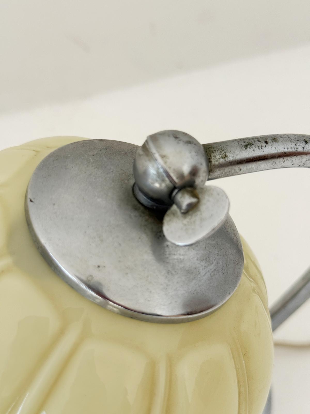 An elegant pair of vintage bedside lamps, made in the 1960s. The chrome-plated metal frame features a circular base and curved arm, while the spherical mustard yellow opal glass shades feature a fluted finish that diffuses the light softly.