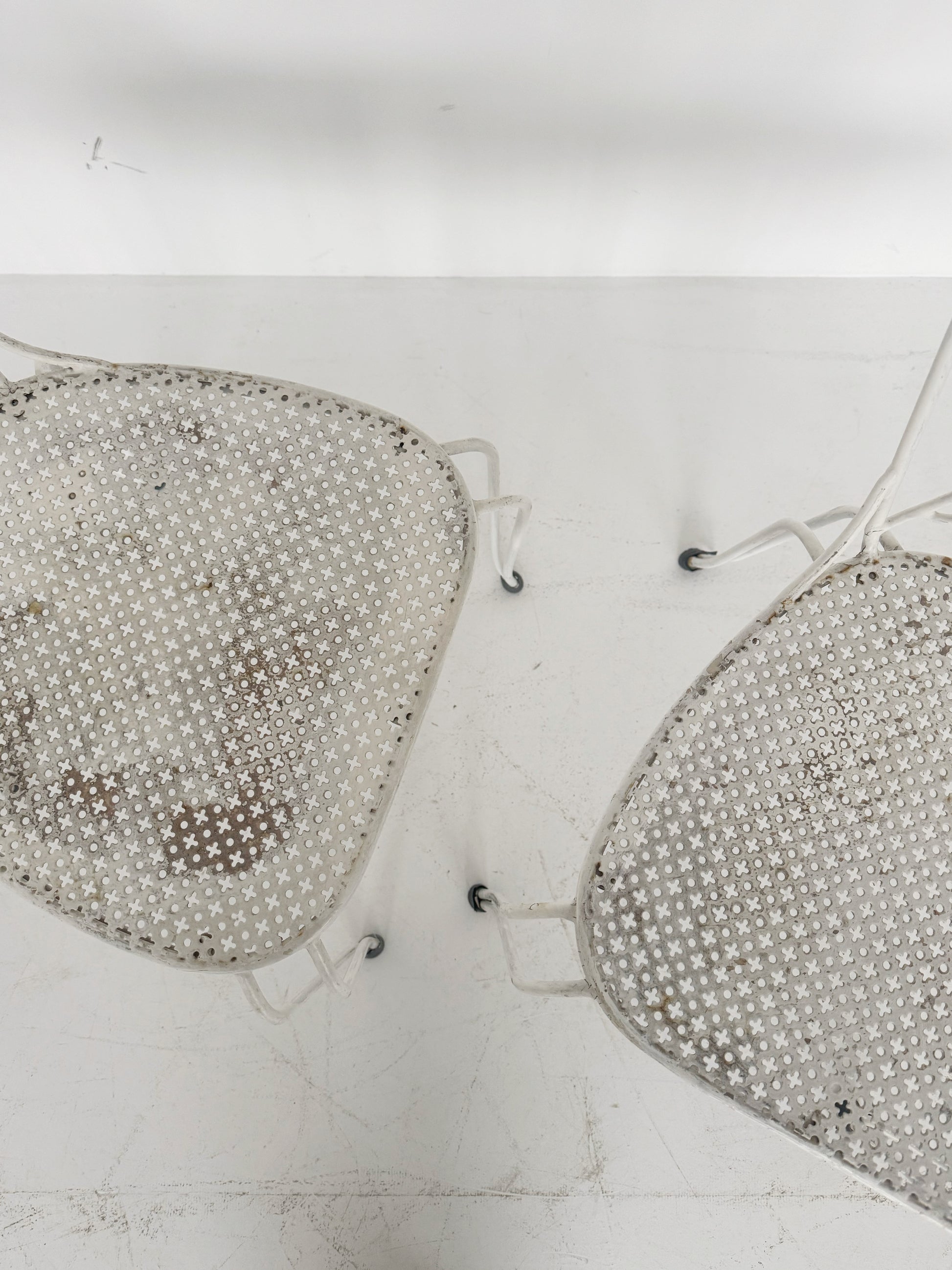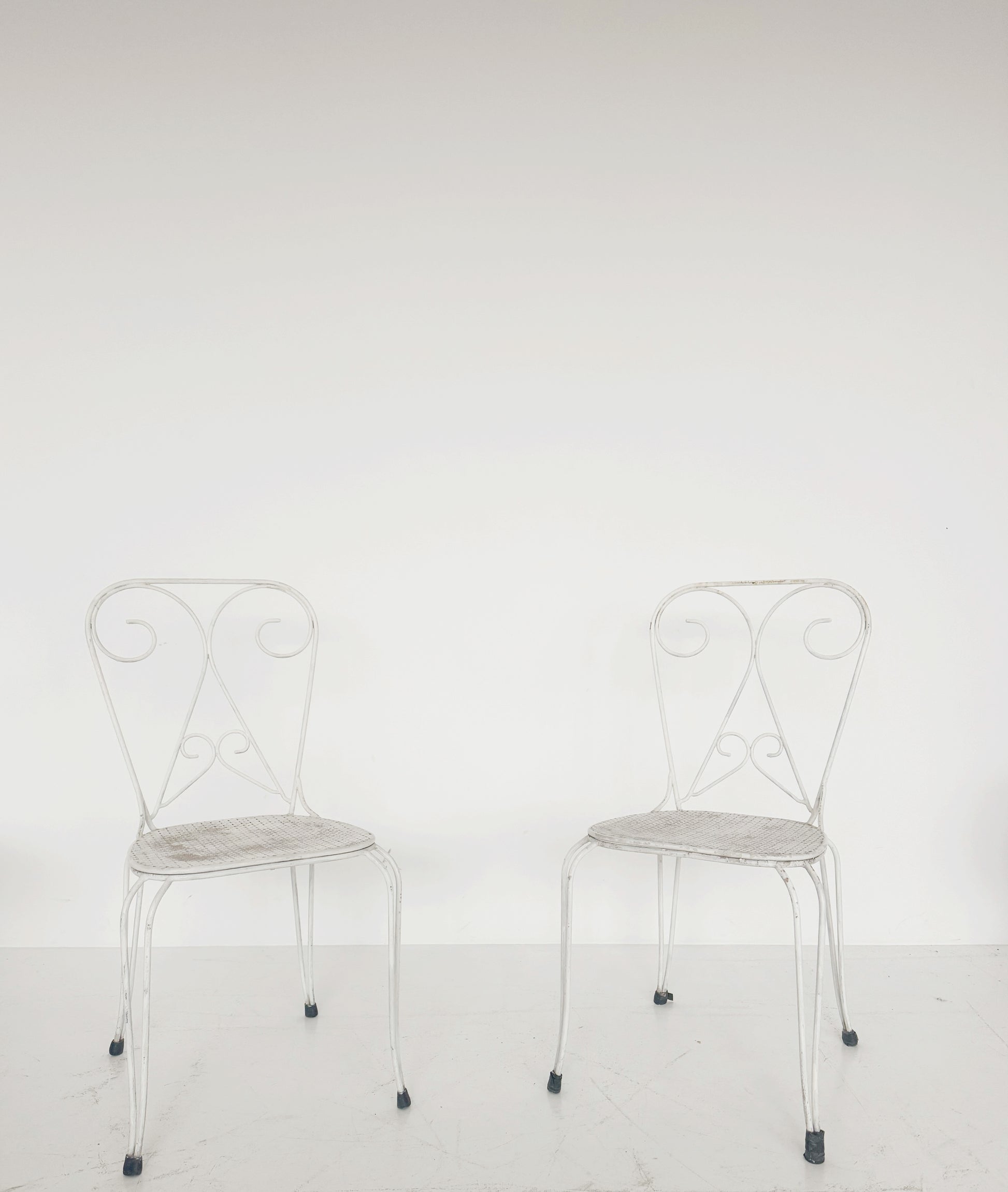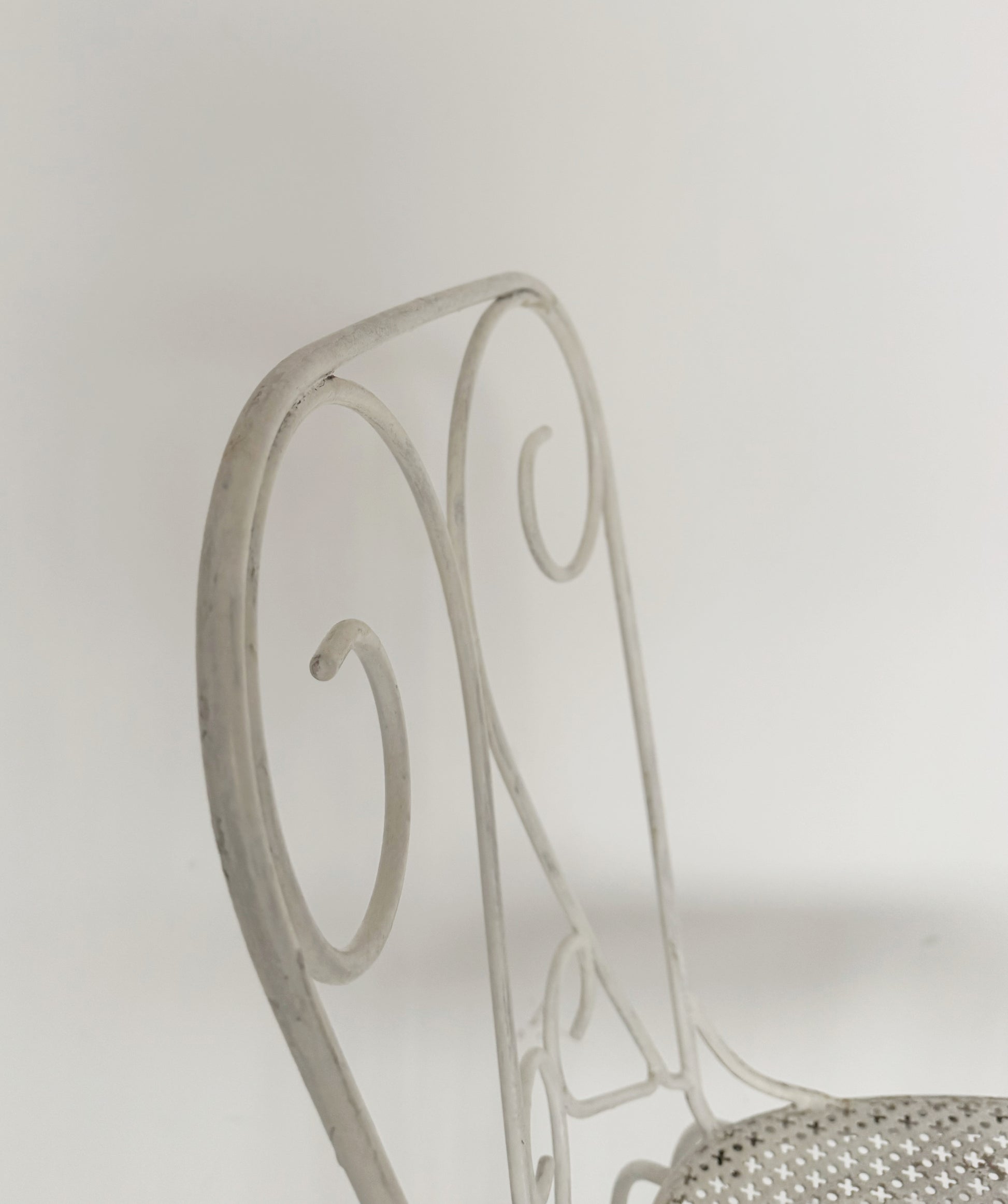 A pair of vintage chairs crafted from white-painted wrought iron, designed for gardens and outdoor spaces. The backrest is decorated with elegant iron scrollwork, lending a light, romantic feel, while the metal mesh seat ensures solidity and durability.