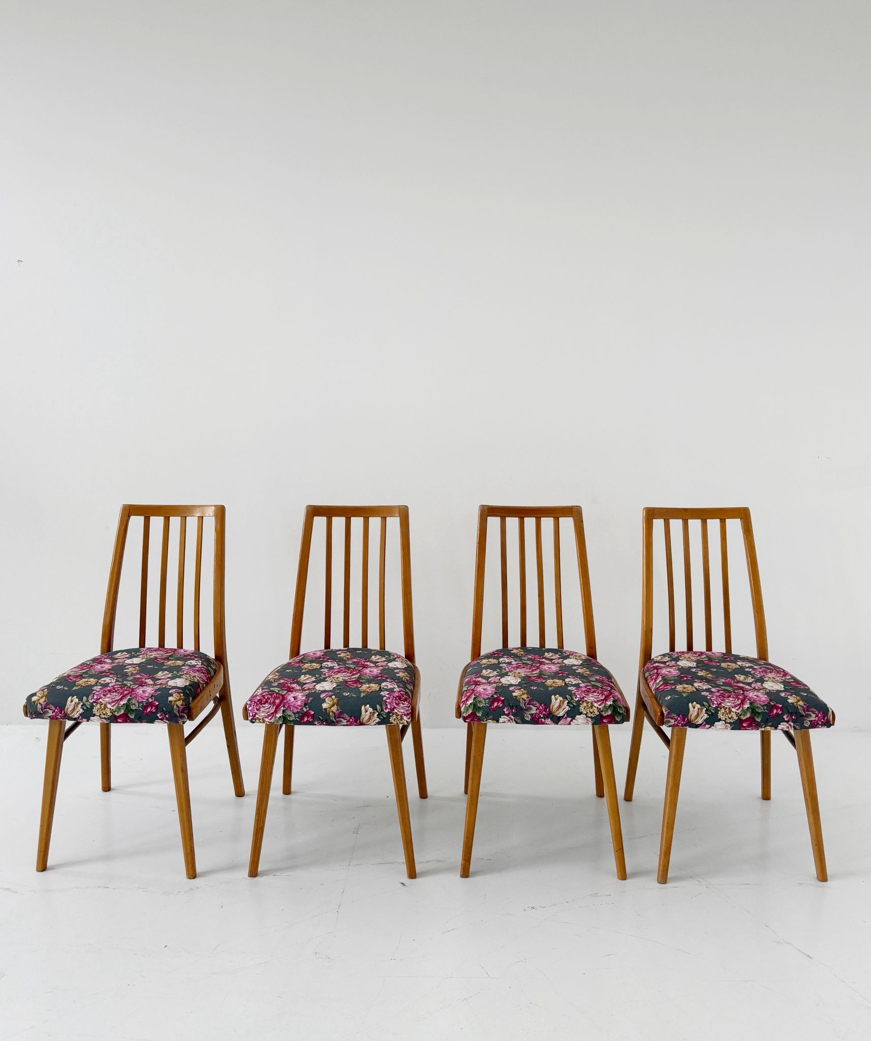 A set of four Czech chairs, made in the 1960s, features a sleek, streamlined design typical of Central Europe of the period. The frame is made of light-colored solid wood (beech), with a high backrest formed by thin vertical slats that complement the curve of the backrest, making it comfortable and visually light.