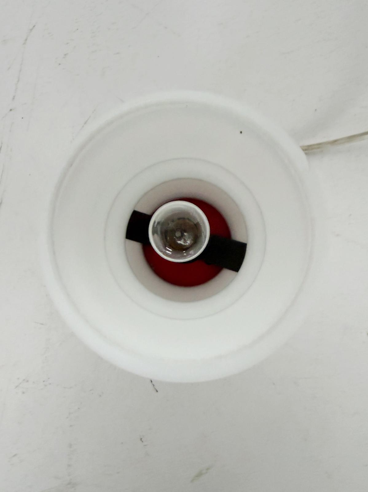 The cylindrical base, lacquered in bright red, adds a vibrant chromatic accent, creating an elegant contrast with the purity of the glass. The clean lines and balanced proportions make this lamp a discreet yet distinctive decorative object.