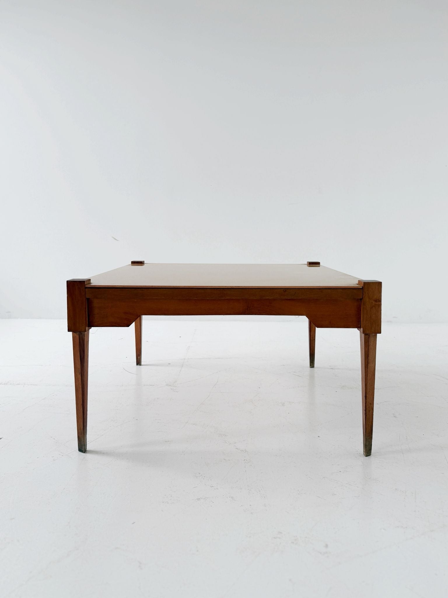 This mid-century coffee table features a solid wood frame and tapered, slightly inclined legs, lending a sense of sleekness and visual lightness. The upper corners feature small exposed wooden blocks, a typical construction detail of 1950s and 1960s production and indicative of meticulous craftsmanship.