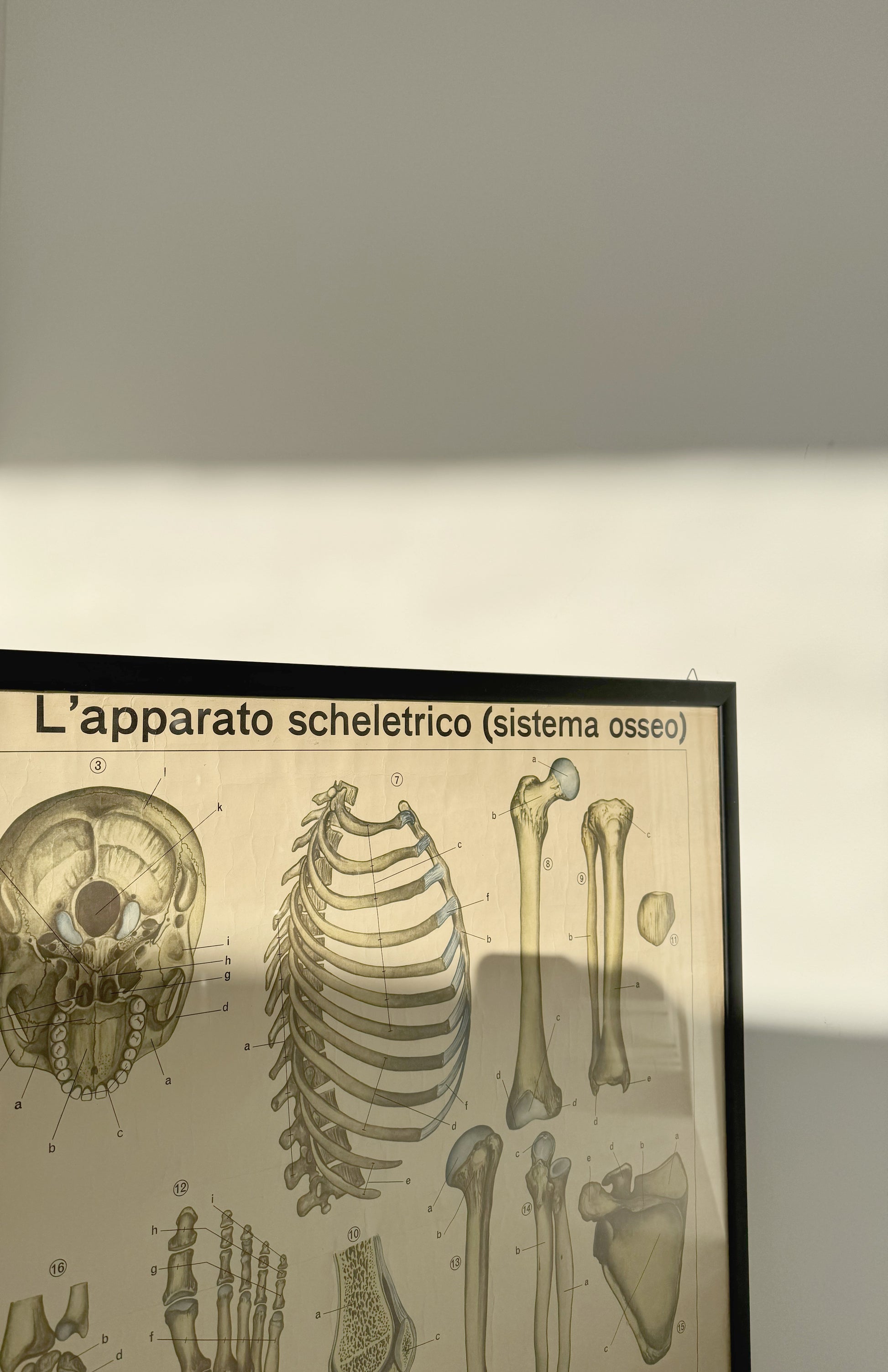 Add a touch of retro charm to your space with this elegant vintage anatomical poster dedicated to the human skeletal system. Produced by the De Agostini Geographic Institute in Novara, the poster features detailed and finely colored illustrations of the skeleton and the main bones of the human body, accompanied by captions in Italian that recall the didactic design of old school tables.