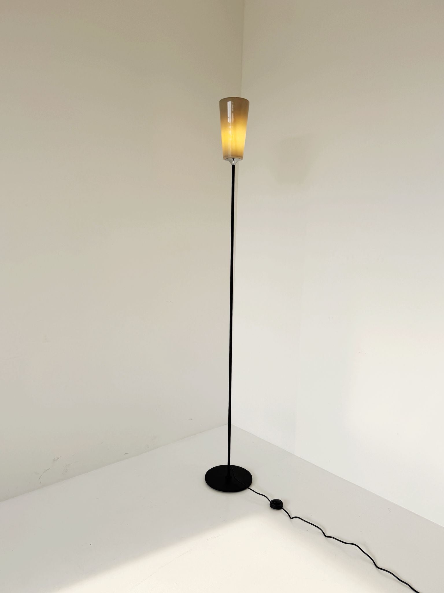 A refined floor lamp with a minimalist vintage design, perfect for adding a touch of elegance and warmth to any space. The slender black metal frame supports a conical amber glass shade, which diffuses a soft, welcoming light. Ideal for living rooms, bedrooms, or studies with a retro or modern feel.