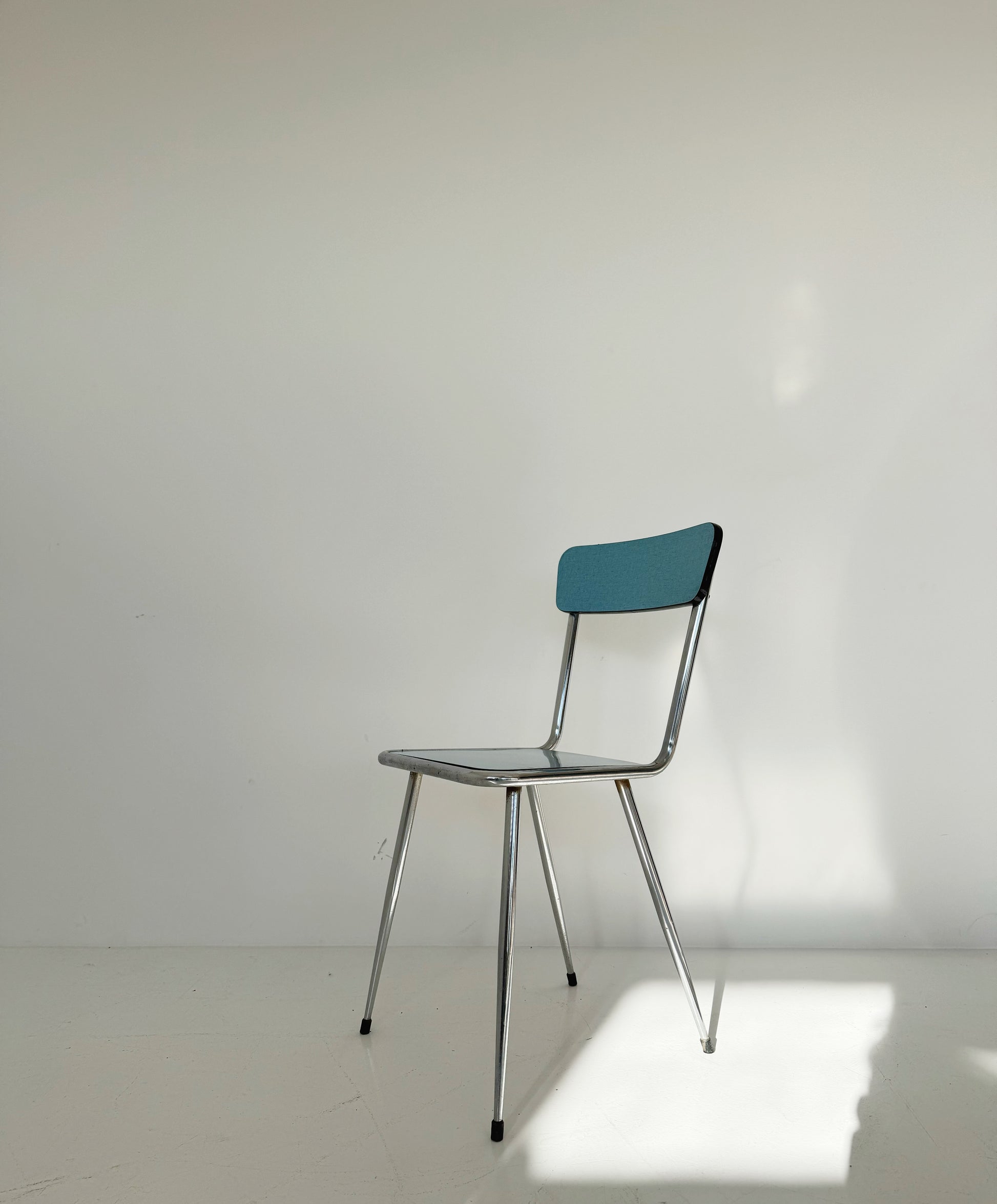Add a touch of authentic retro design to your space with this elegant vintage chair. Featuring a chromed metal frame and a pastel blue laminate seat and backrest, it perfectly evokes the essential and bright aesthetic of 1960s and 1970s furniture.