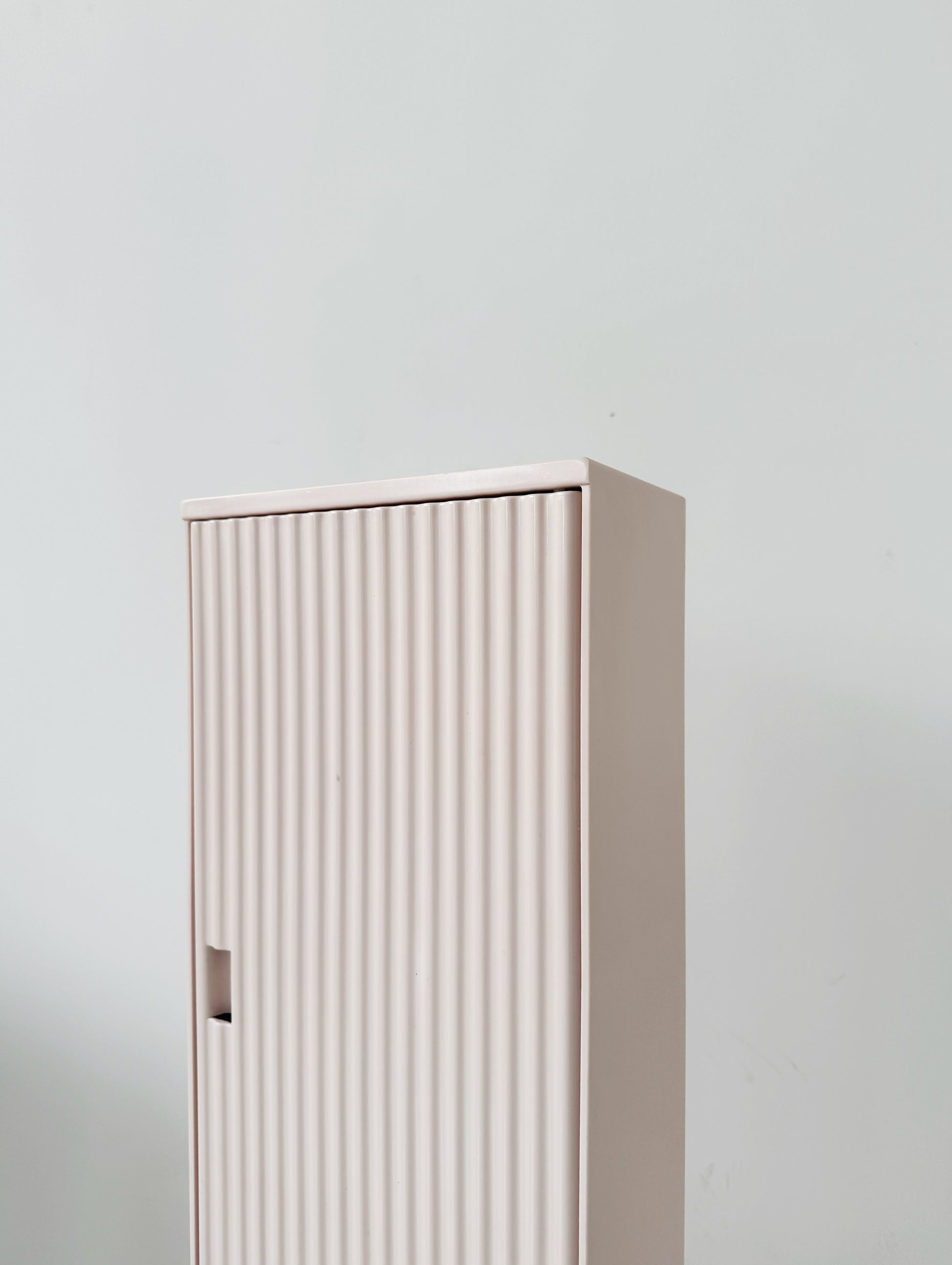 The cabinet features a front hinged door with a vertically grooved surface, subtly recalling the aesthetic of a rolling shutter while retaining a traditional opening mechanism. The handle is seamlessly integrated into the door itself, emphasizing a minimalist approach and visual continuity.
