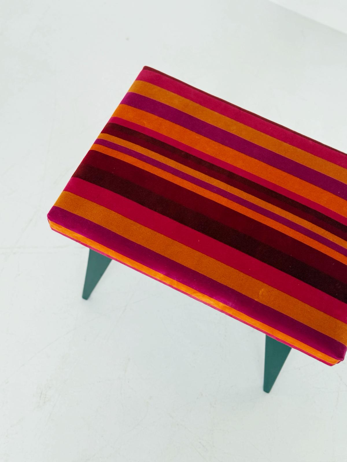 This vintage pouf features a simple, bold design, featuring a rectangular padded seat upholstered in horizontally striped fabric in vibrant shades of red, orange, and fuchsia. The color combination gives the piece a strong visual impact and recalls the mid-century/1960s–1970s style, perfect for adding a pop of color to any space.
