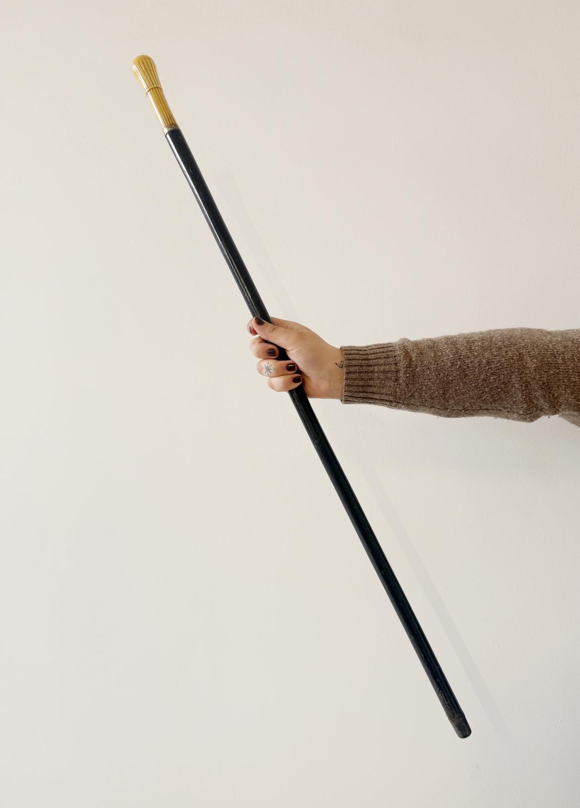 The shaft is made of black lacquered wood, long and slender, with a metal ferrule connecting the handle and stick. The proportions are elegant, the silhouette precise and clean.