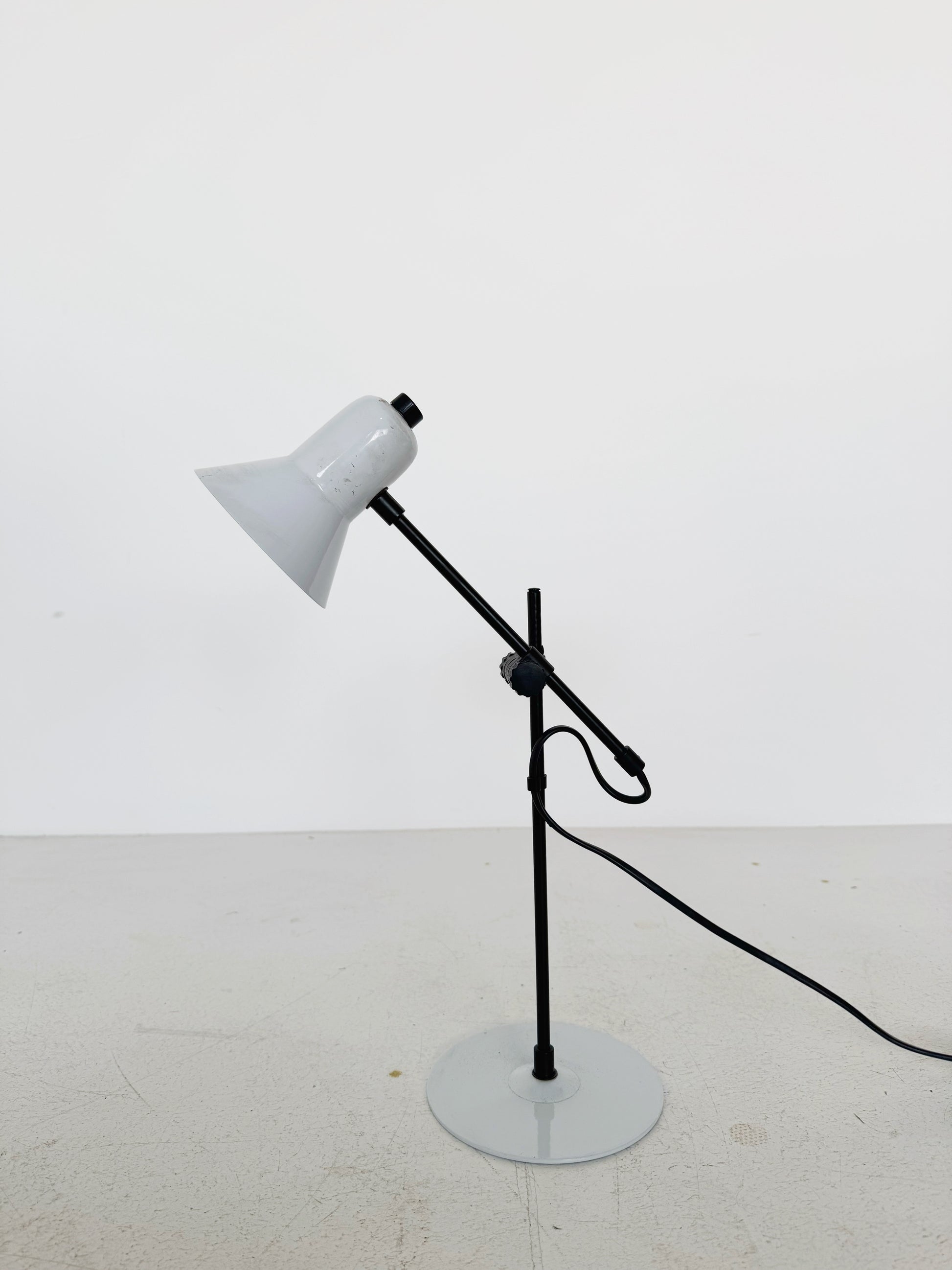 Table lamp,1970s, base and lamp in white metal, structure in black metal, adjustable light