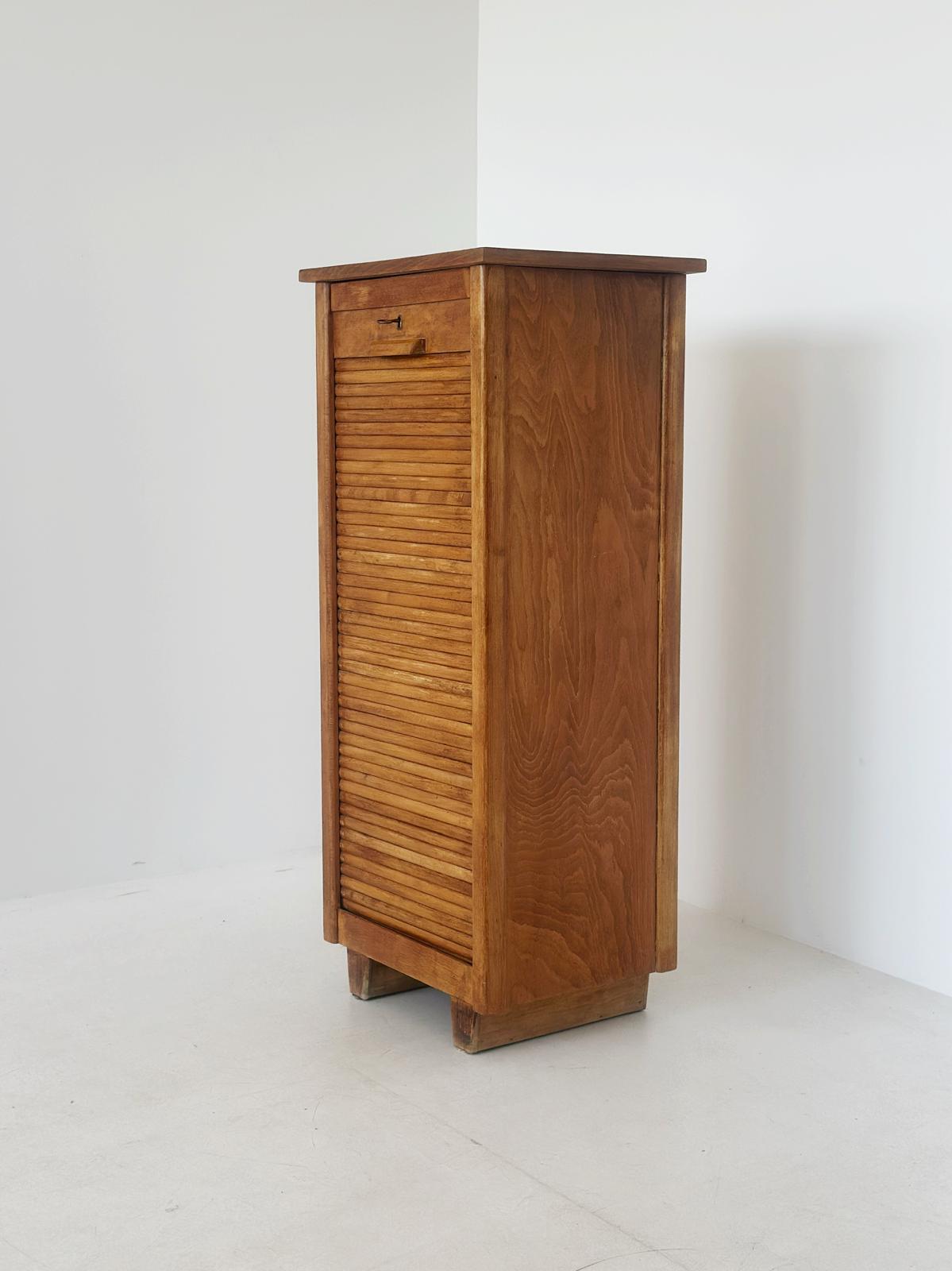 Questo mobile è un archivio a serrandina, tipicamente utilizzato in ambienti d’ufficio o studi professionali tra gli anni ’40 e ’60, ma con una forma che lo colloca più precisamente intorno agli anni ’50.
