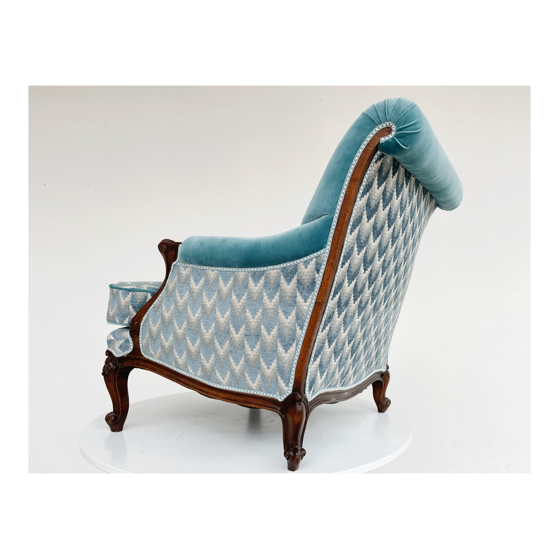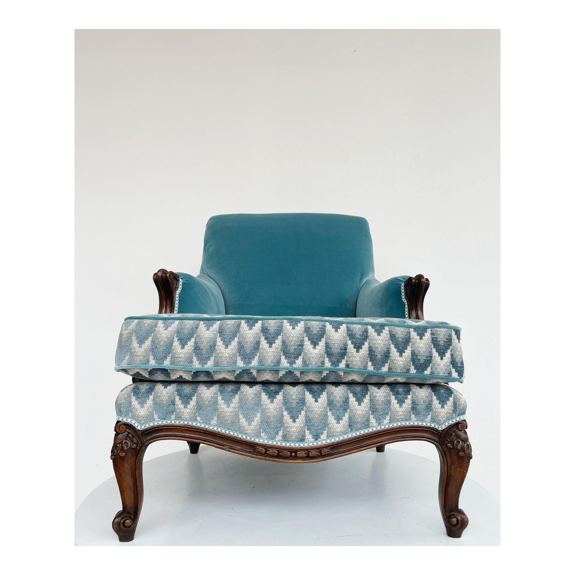 Poltrona,1960, struttura in legno, rivestimento in velluto di cotone e tessuto