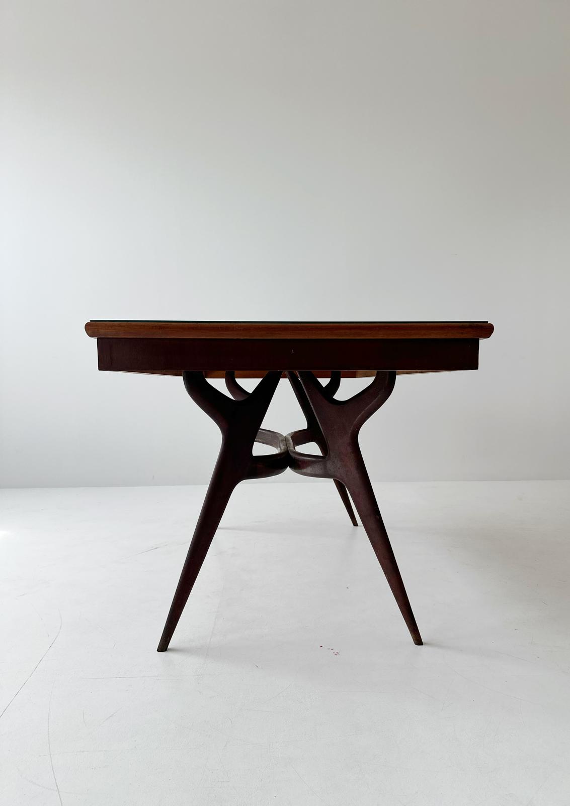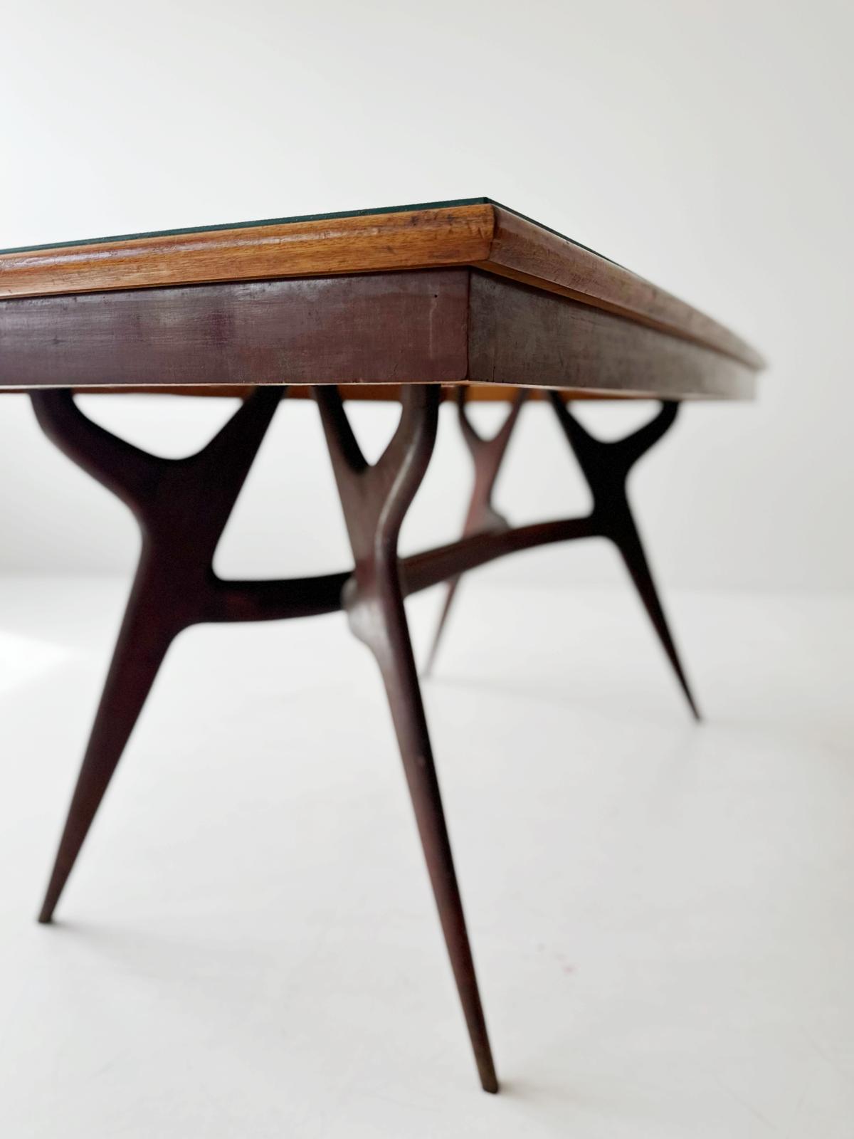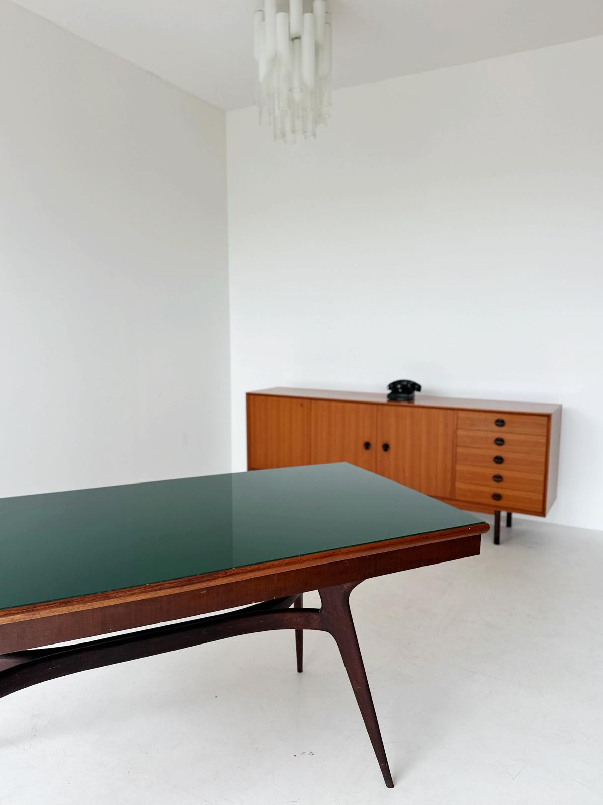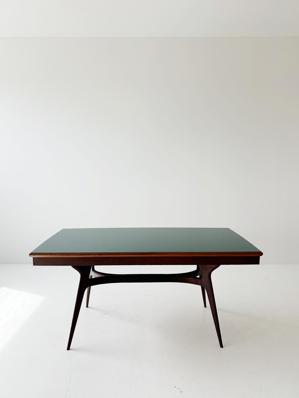 Il tavolo nella foto ha un design elegante con il piano in vetro verde scuro. Il vetro ha una finitura liscia e riflettente, che aggiunge un tocco di raffinatezza all'insieme. La struttura è in legno massello scuro, con gambe sottili ma robuste che si prolungano in modo affusolato verso il pavimento. Le gambe sono angolate verso l'esterno, creando una silhouette snella e dinamica. La cornice sotto il piano ha un design curvilineo, che aggiunge un tocco organico e rende visivamente leggera l'intera costruzione, nonostante l'utilizzo di materiali solidi.
