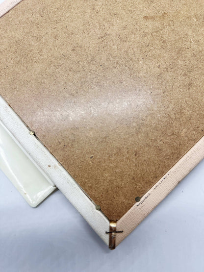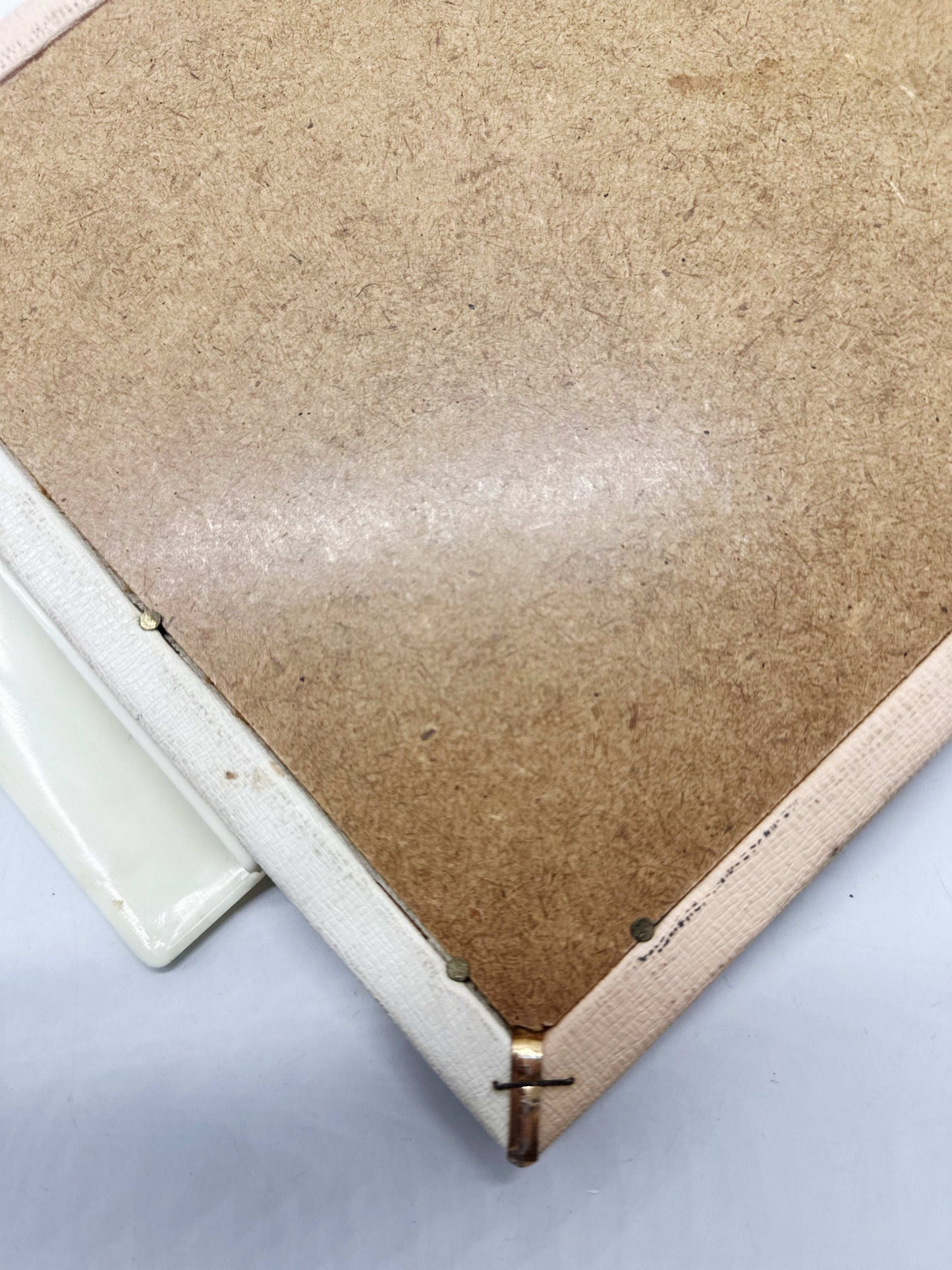 Vassoio,1960s, cornice in plastica bianca, piano in vetro rosa con disegno