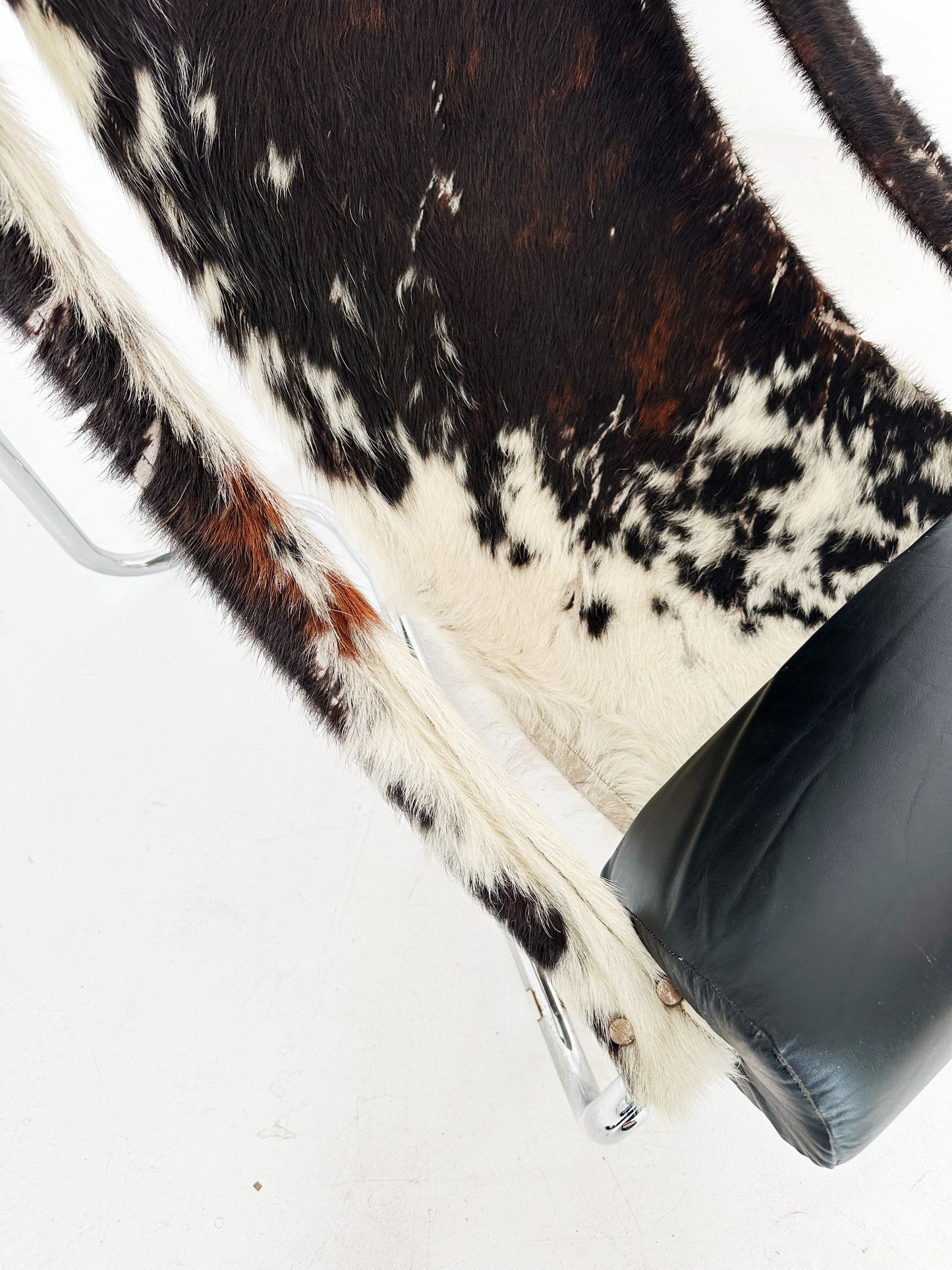 Un dettaglio distintivo è il rivestimento in pelliccia bovina che aggiunge un tocco di calore e contrasto materico rispetto alla freddezza del metallo
