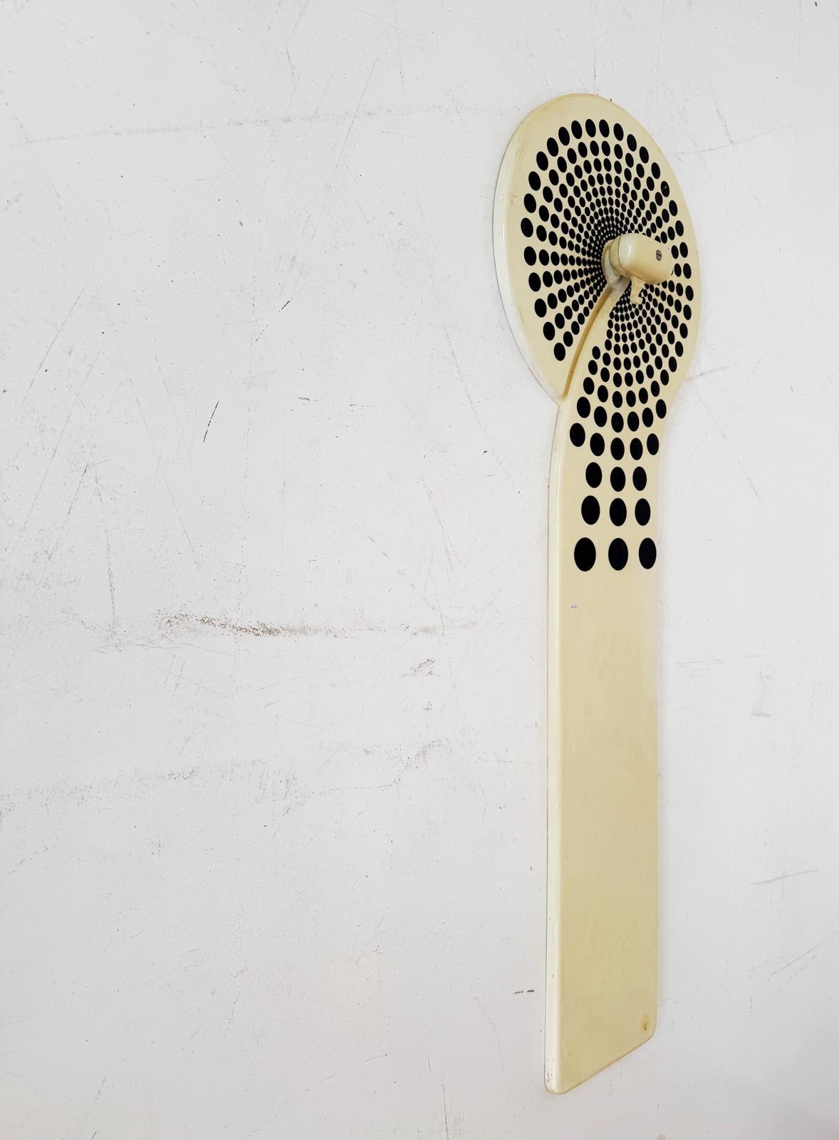 Originale appendiabiti vintage da parete dal forte impatto grafico, riconducibile al design spaziale e sperimentale degli anni ’70. Realizzato in plastica stampata color avorio, presenta una forma scultorea e dinamica, arricchita da una decorazione a fori circolari neri disposti in un motivo ottico concentrico che cattura immediatamente lo sguardo.