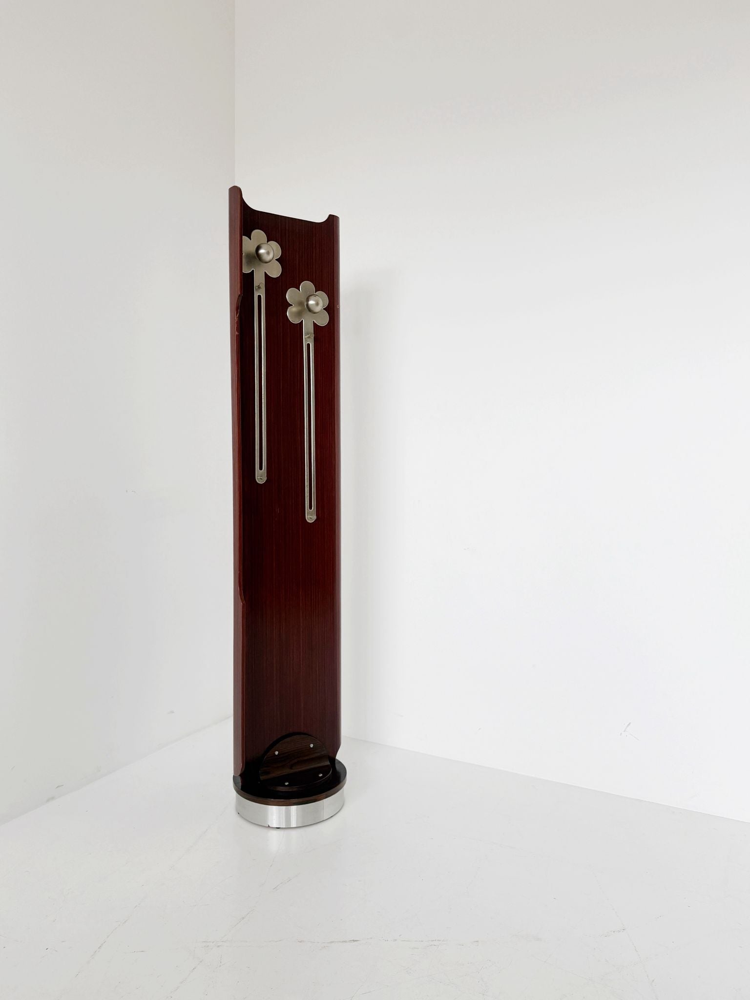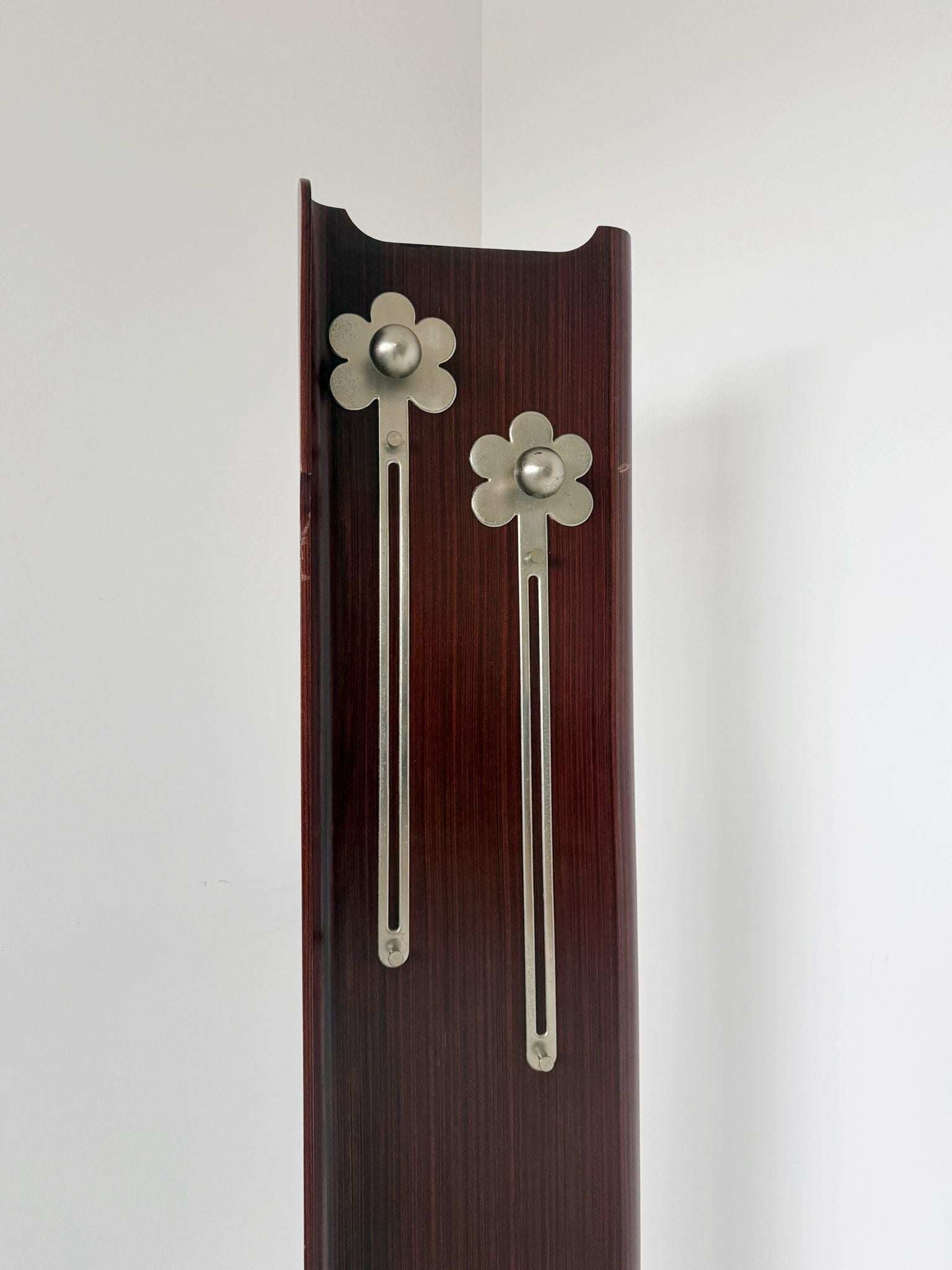 Appendiabiti vintage girevole dal design raffinato ed essenziale, perfetto per arricchire ingressi, uffici o ambienti dal gusto retrò e modernista. La struttura verticale è realizzata in legno scuro con finitura calda e naturale, valorizzata da dettagli in metallo satinato.