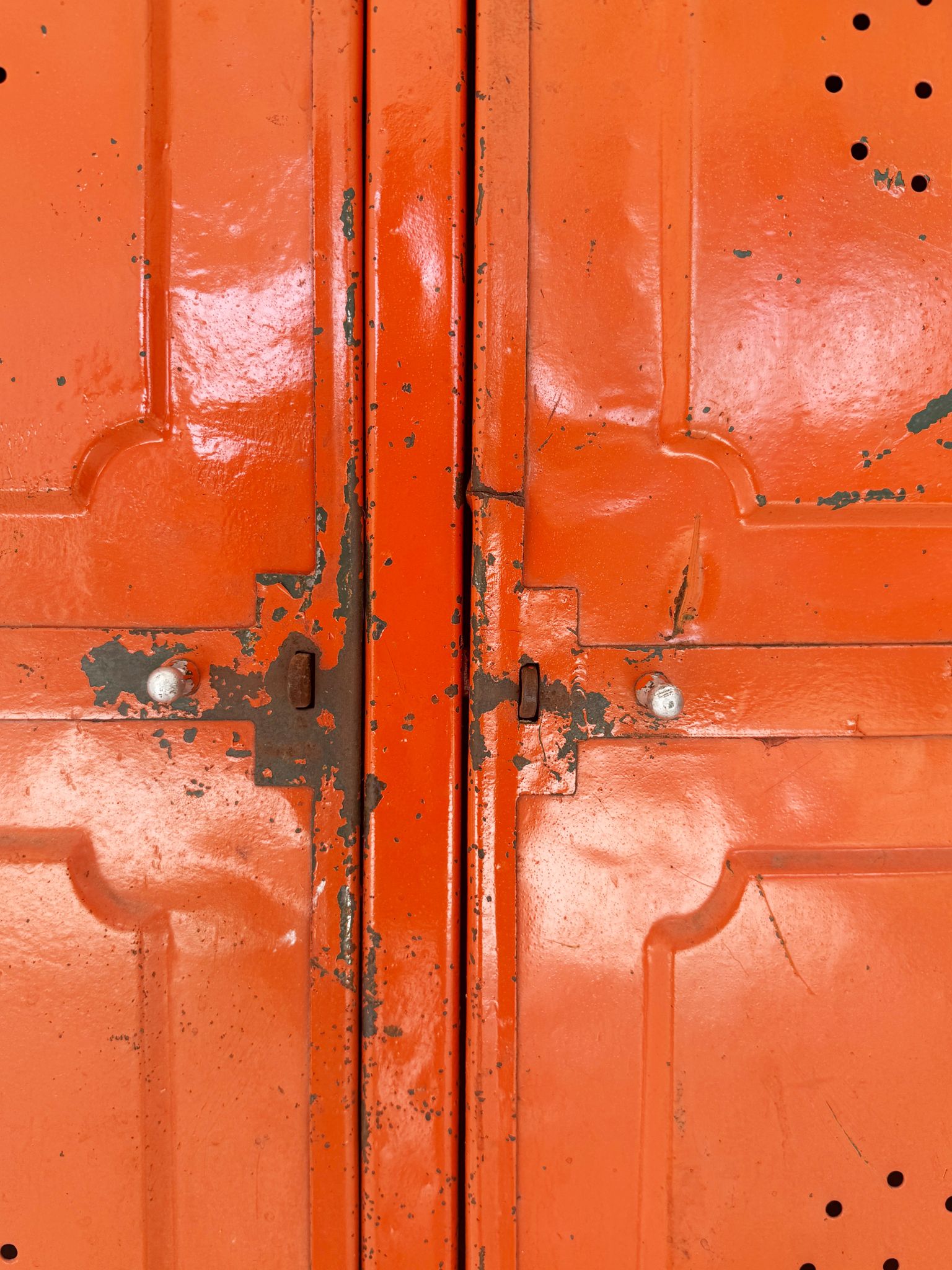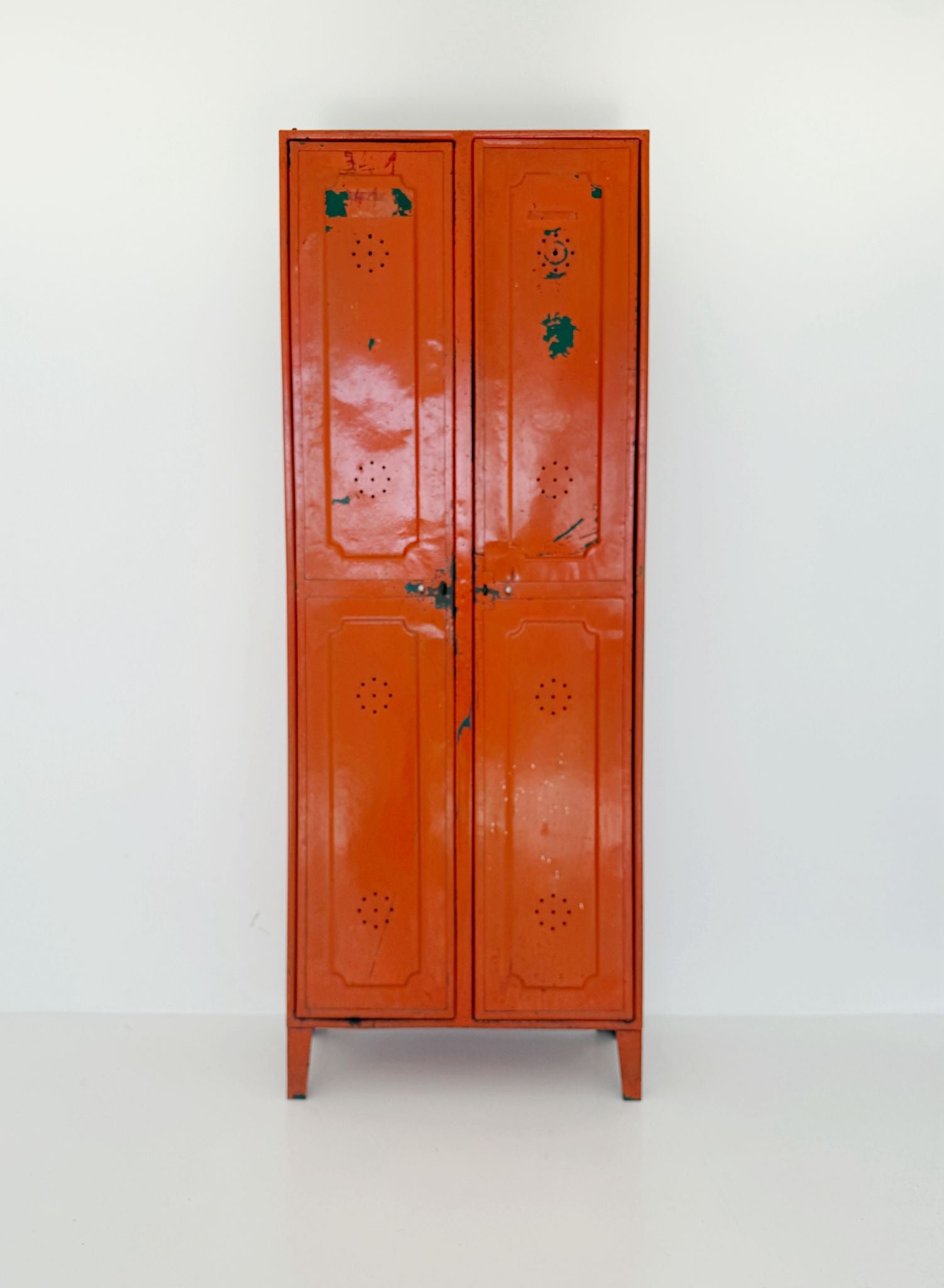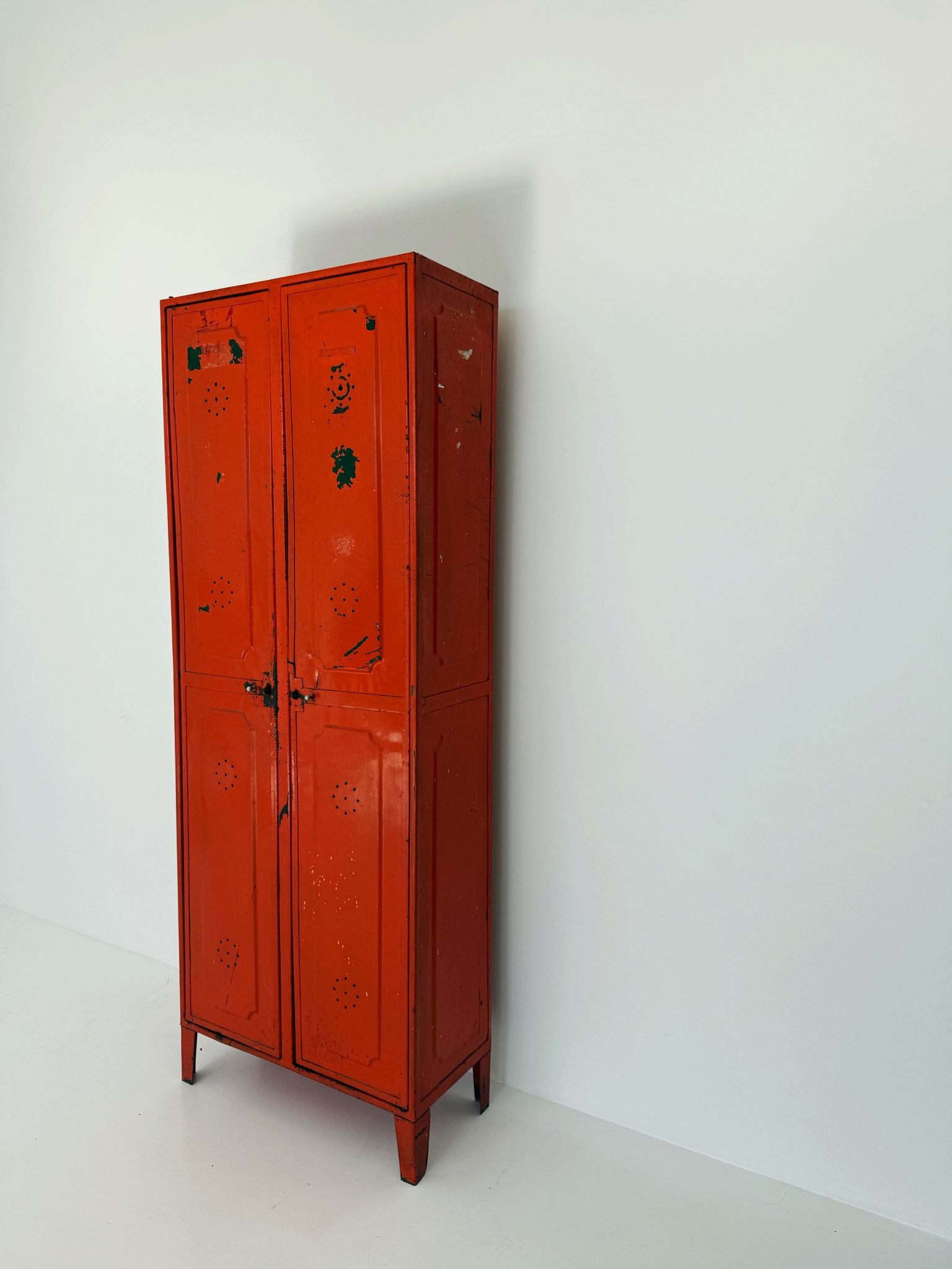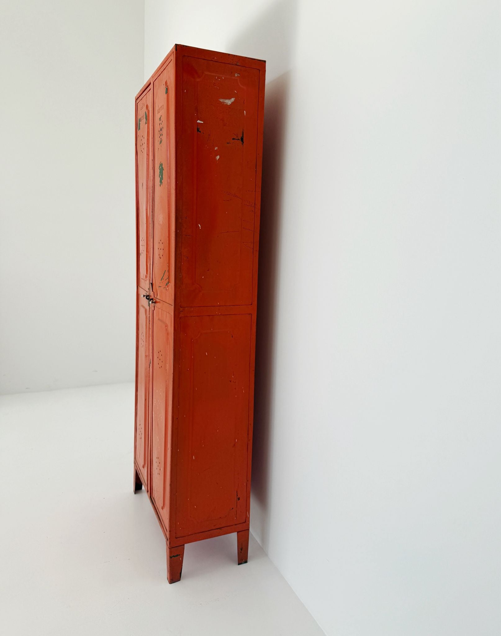 Armadietto,1960, struttura in ferro arancione, due ante, all'interno piccoli appendini