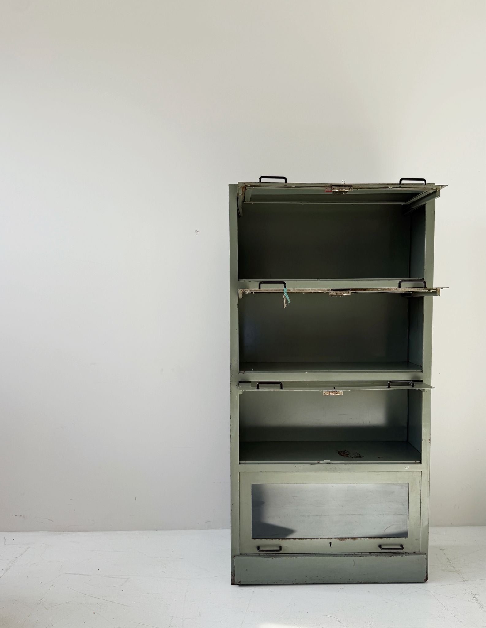 Grande armadio archivio di provenienza professionale, interamente realizzato in lamiera d’acciaio verniciata in una rara tonalità verde salvia/grigio-verde tipica degli arredi tecnici di metà Novecento.