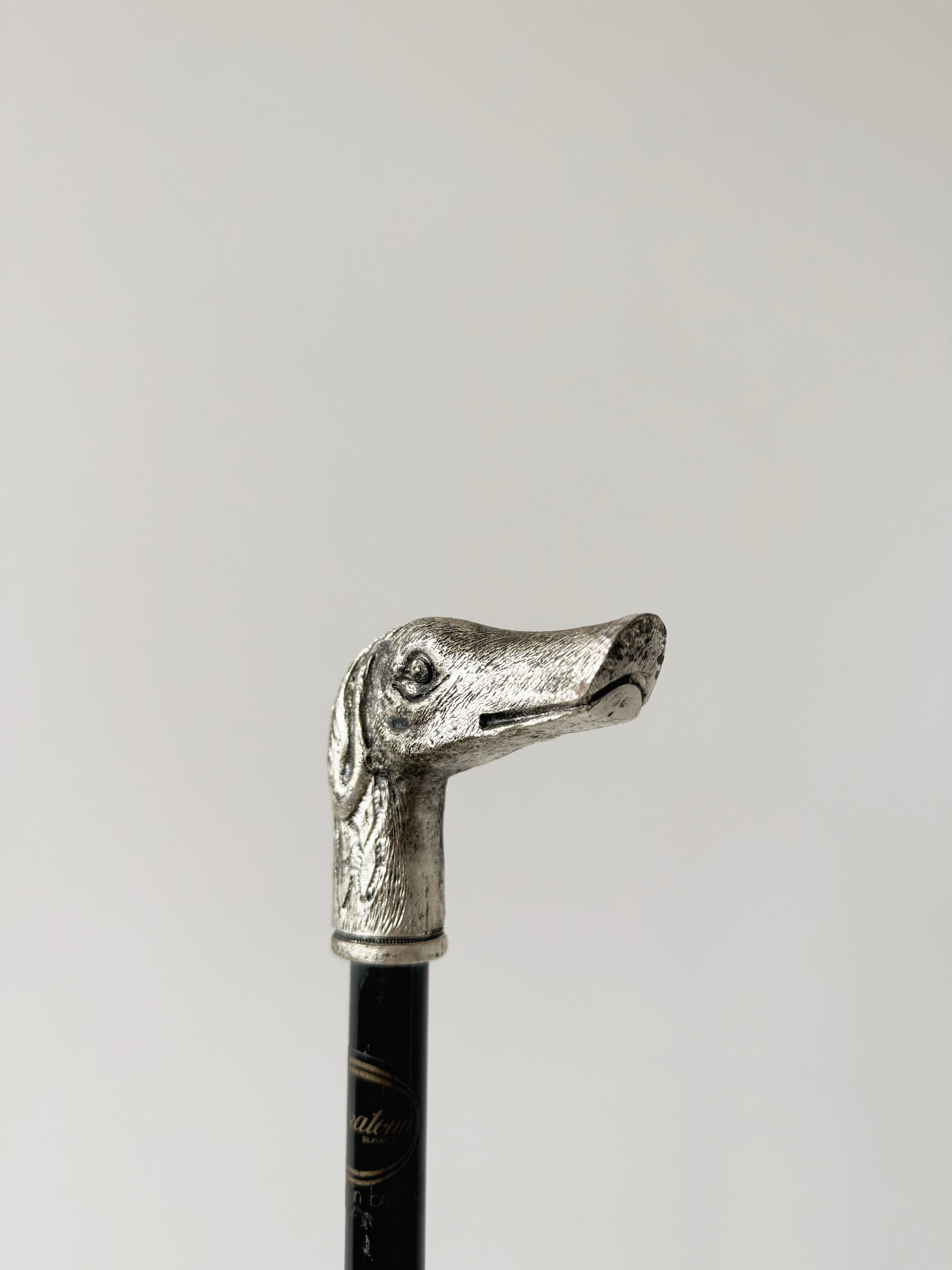 L’elemento distintivo è l’impugnatura scultorea a forma di testa di cane (probabilmente levriero o cane da caccia stilizzato), finemente modellata in metallo color argento con una delicata lavorazione superficiale che richiama il pelo e i lineamenti dell’animale. Il muso allungato e lo sguardo profilato conferiscono al bastone un carattere nobile e aristocratico, tipico dei bastoni da passeggio classici.