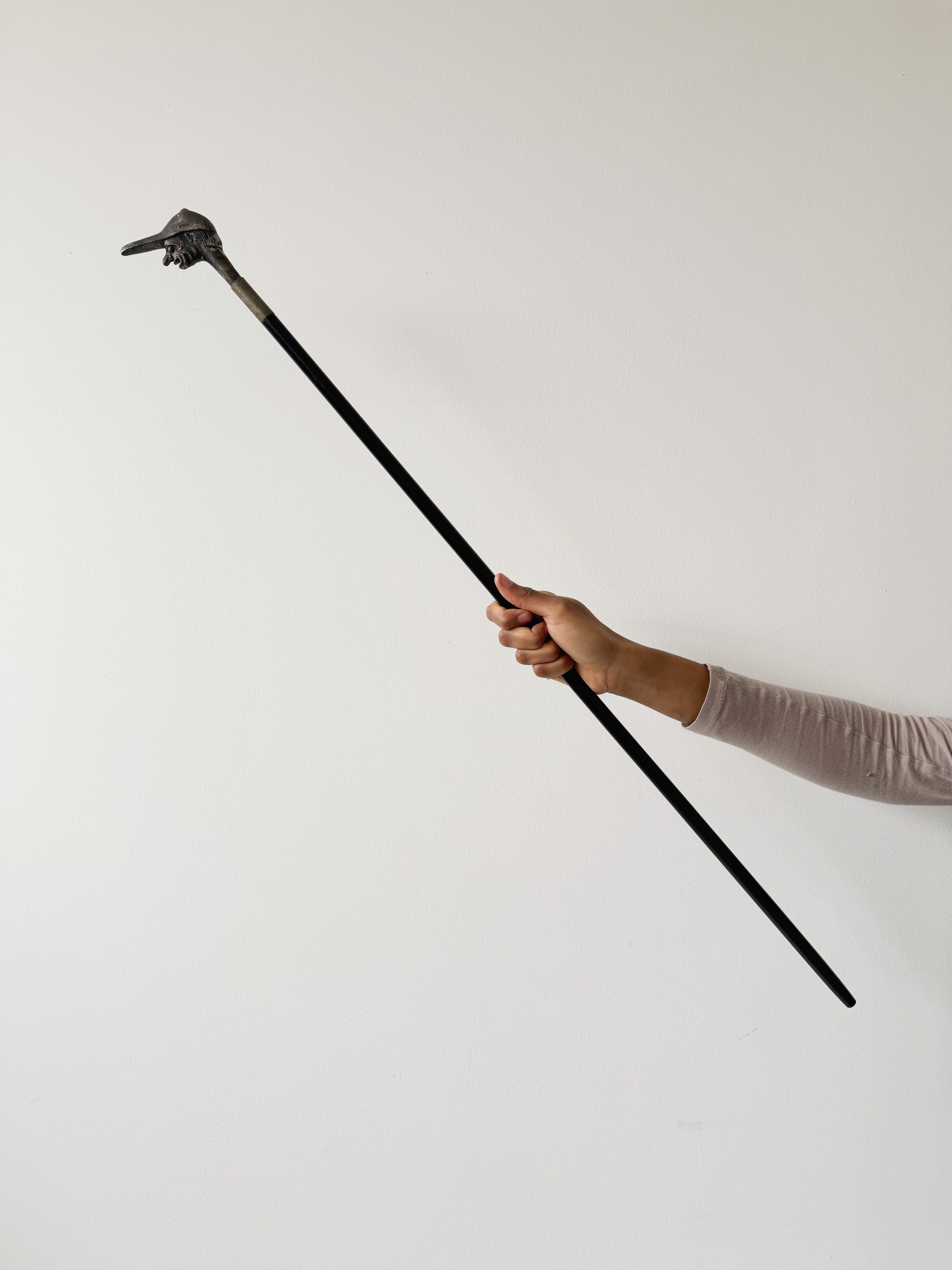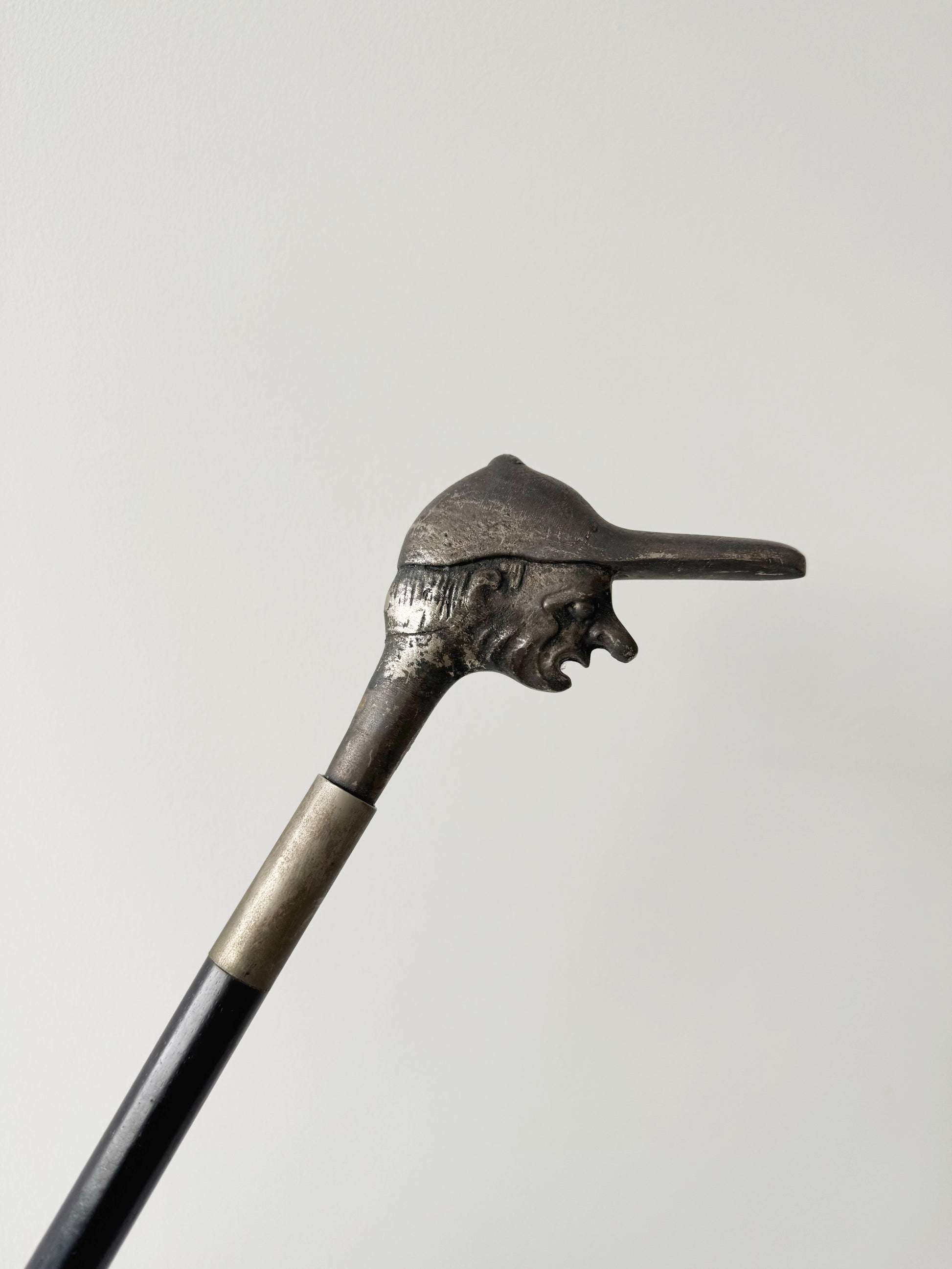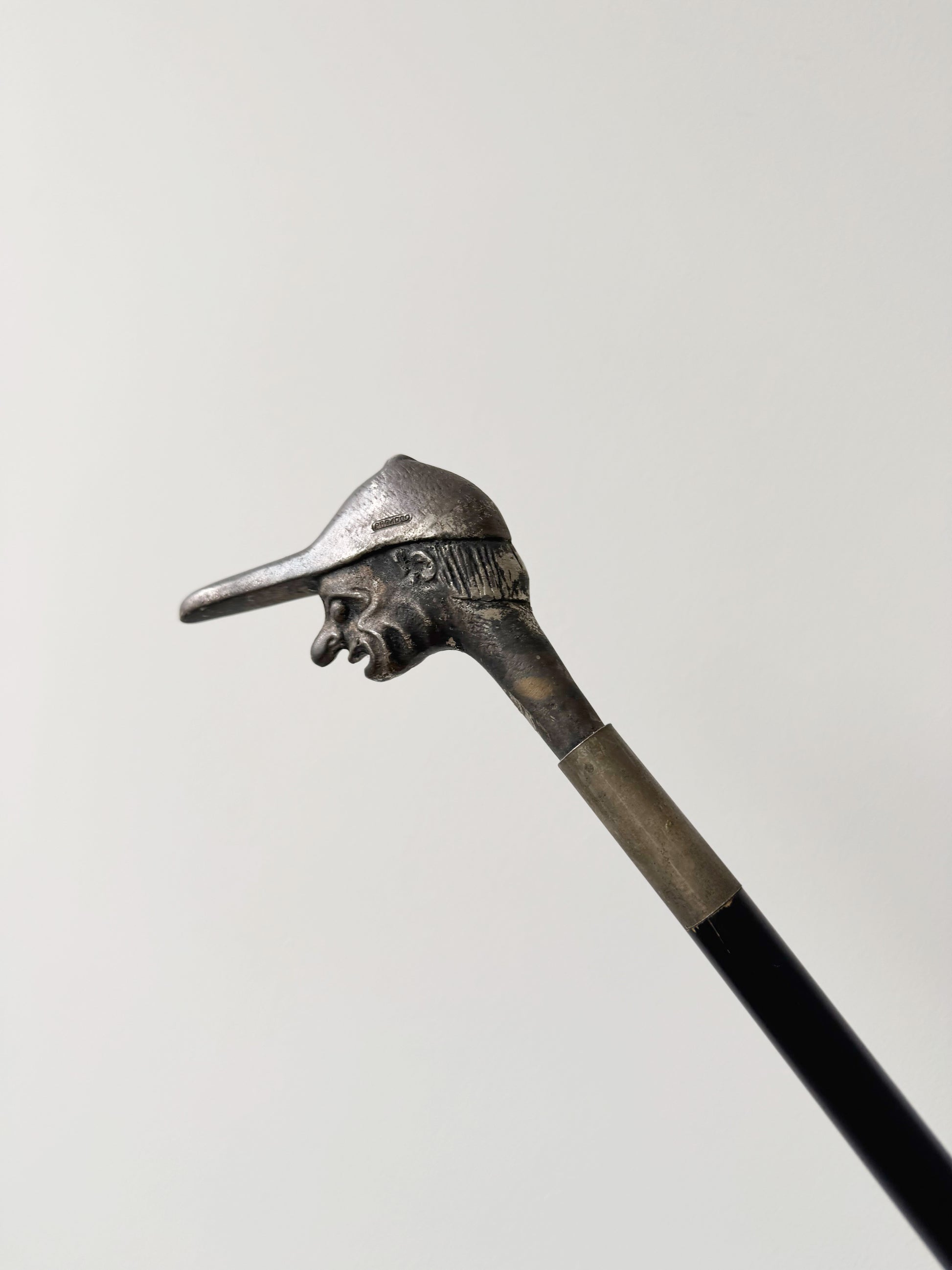 L’elemento distintivo è l’impugnatura scultorea in metallo patinato, modellata come un volto maschile stilizzato sormontato da un cappello con visiera pronunciata. I lineamenti del viso sono dettagliati e ben leggibili: naso prominente, bocca incisa e profilo marcato conferiscono al pezzo un forte carattere espressivo e teatrale, tipico dei bastoni decorativi d’epoca.