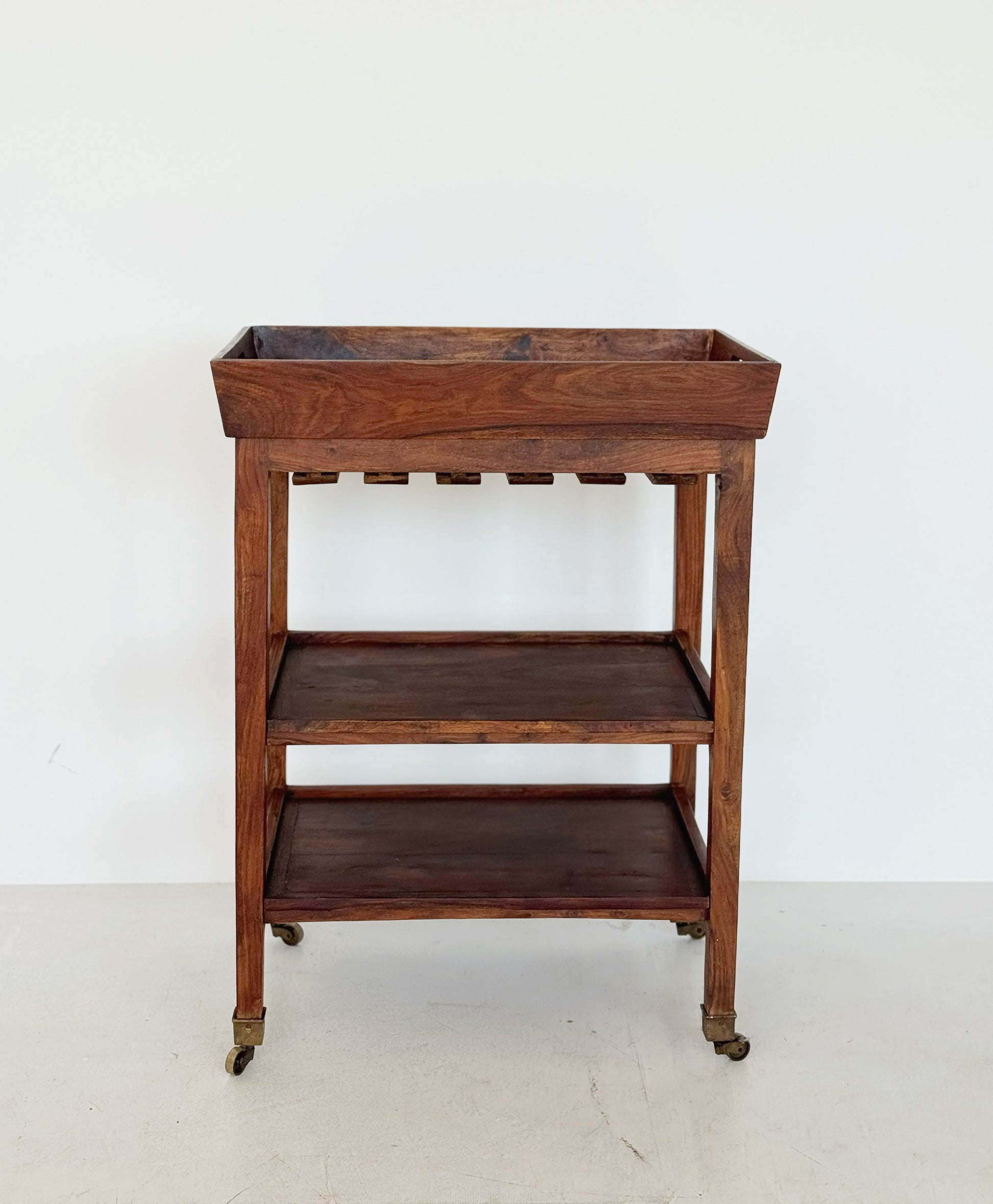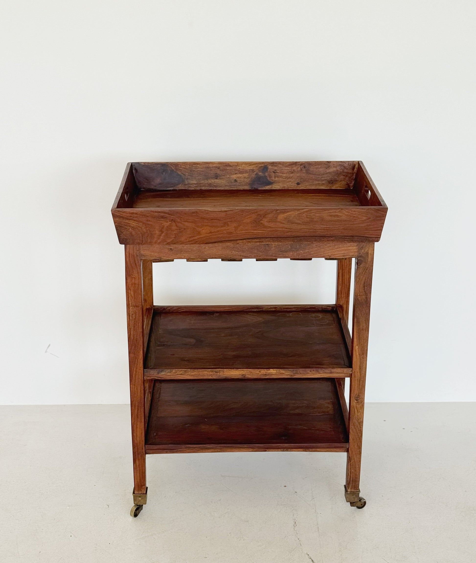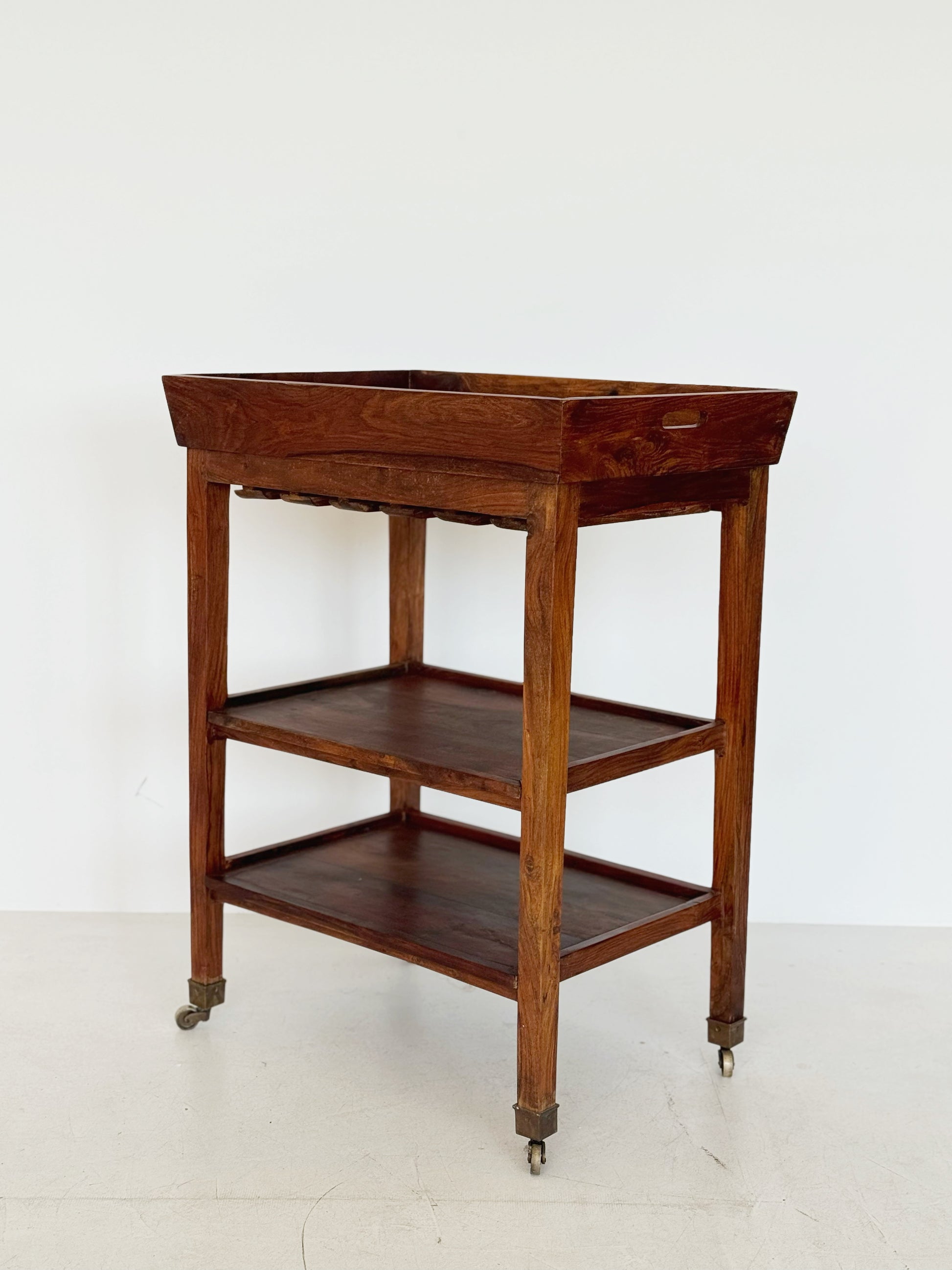 Carrello portavivande, anni '60, struttura in legno con ruote, tre ripiani, il ripiano superiore diventa un vassoio essendo appoggiato sulla struttura.