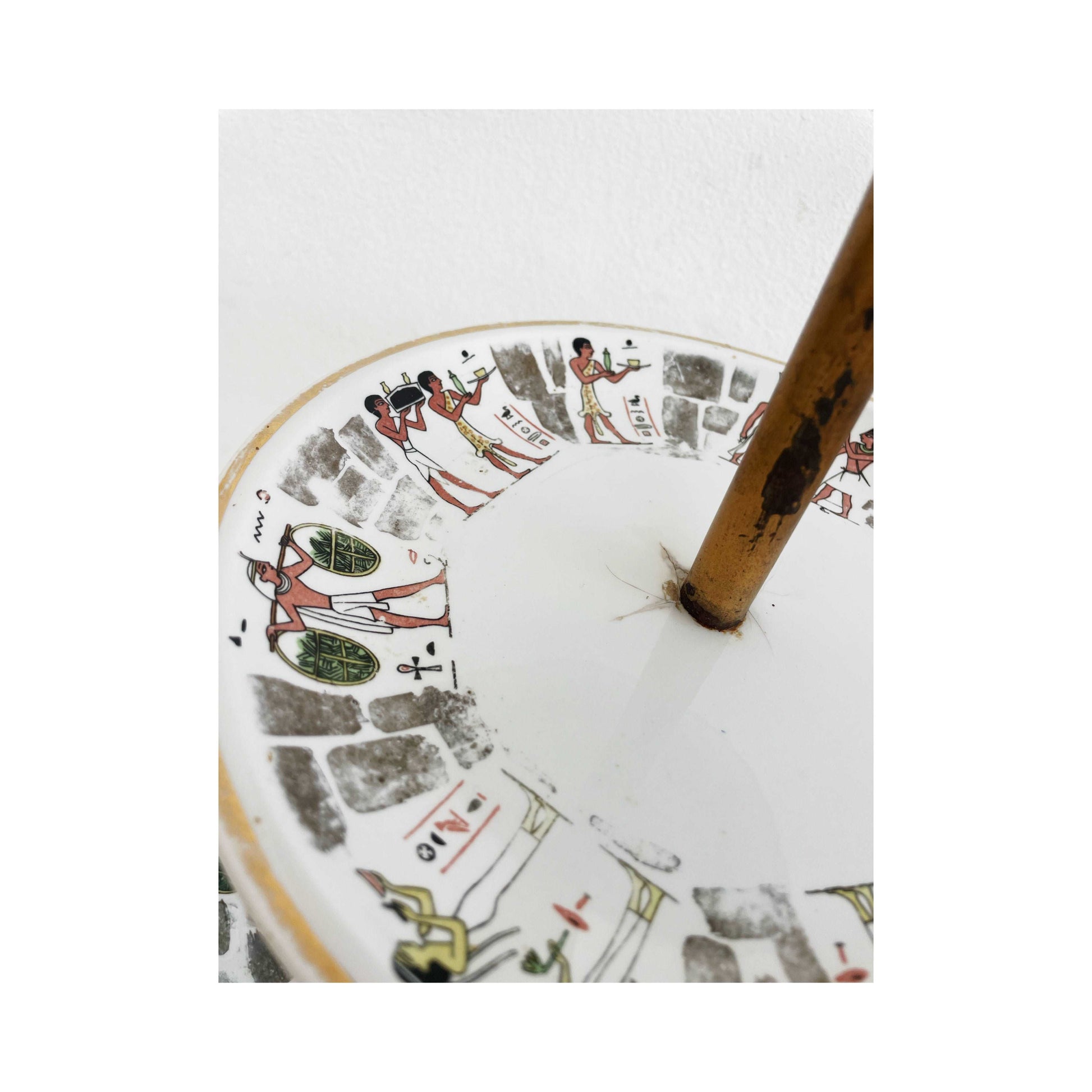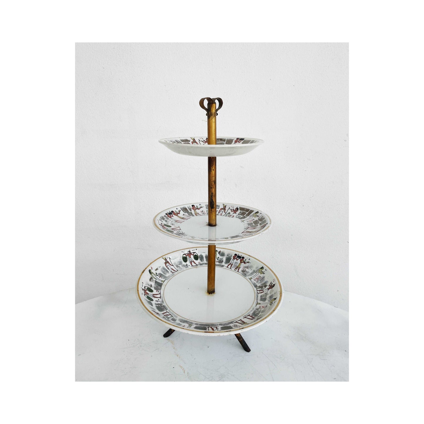 Piccola alzatina,1960, struttura in ottone, tre ripiani in ceramica, con decori egizi