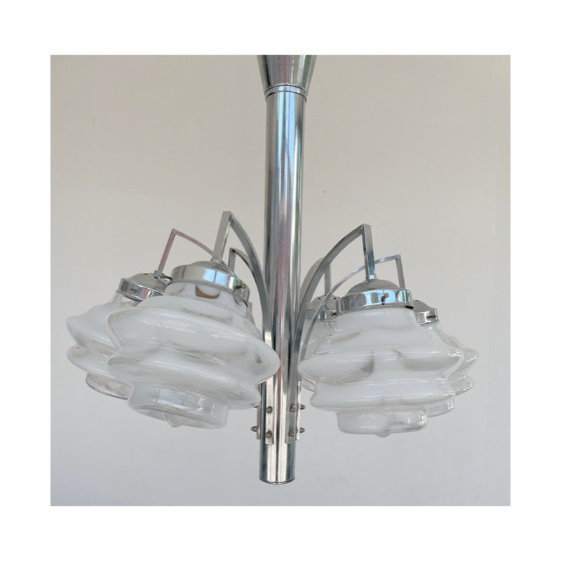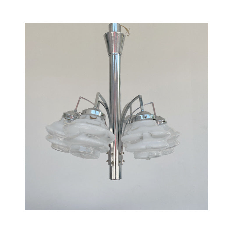 Lampadario,1970, struttura in metallo cromato, sei luci in vetro