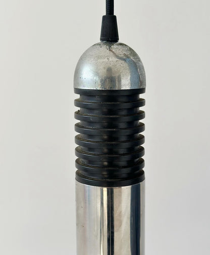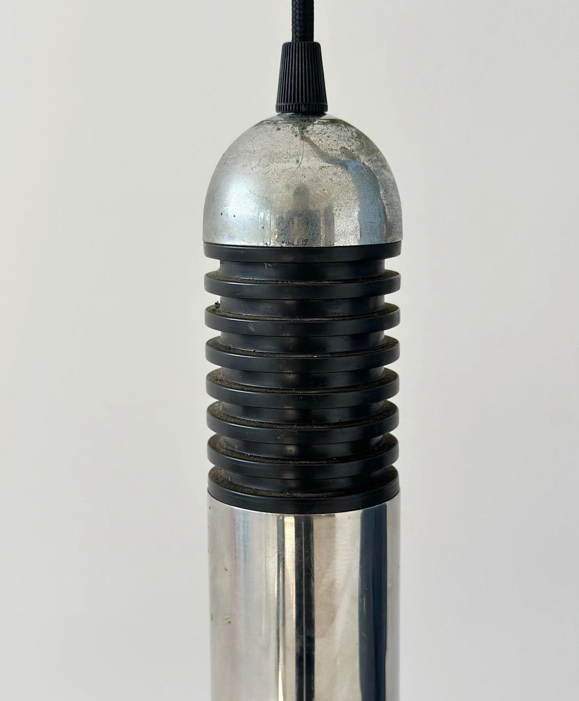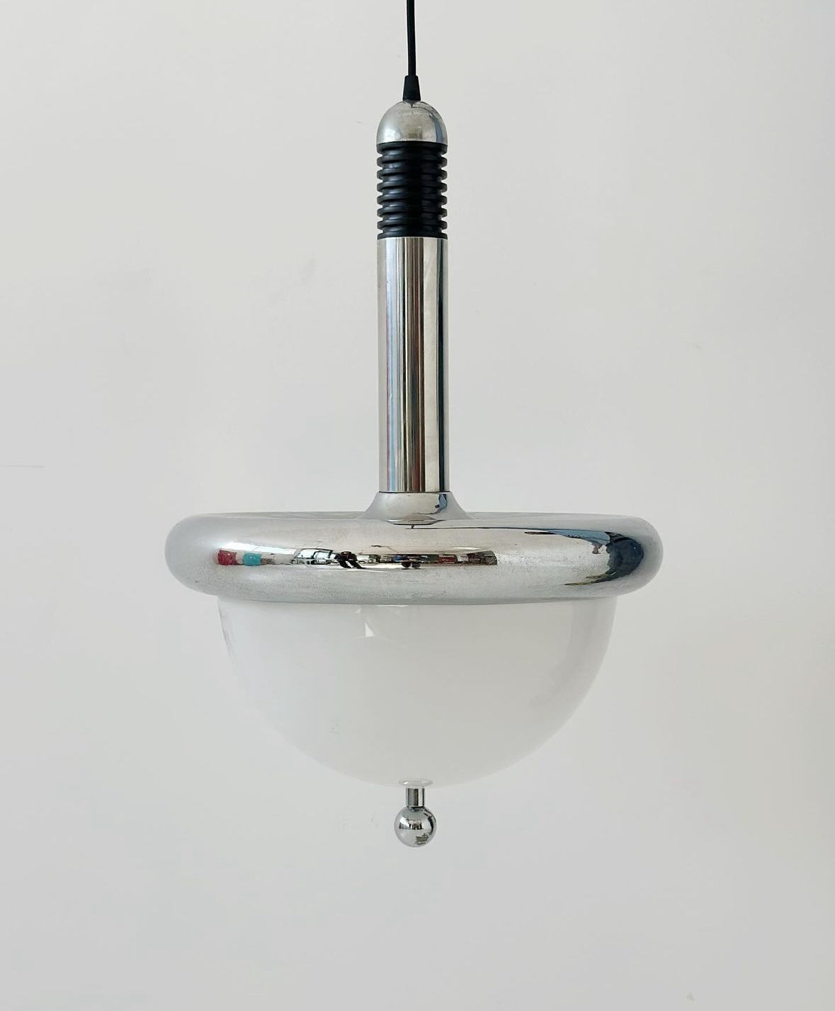 Lampadario,1970, lampada in vetro bianco, struttura in metallo cromato