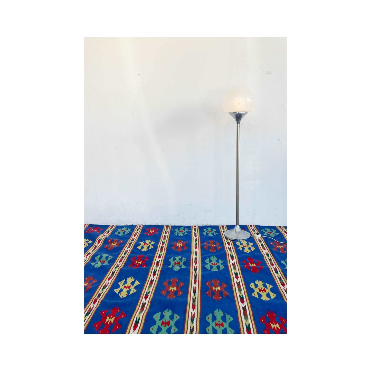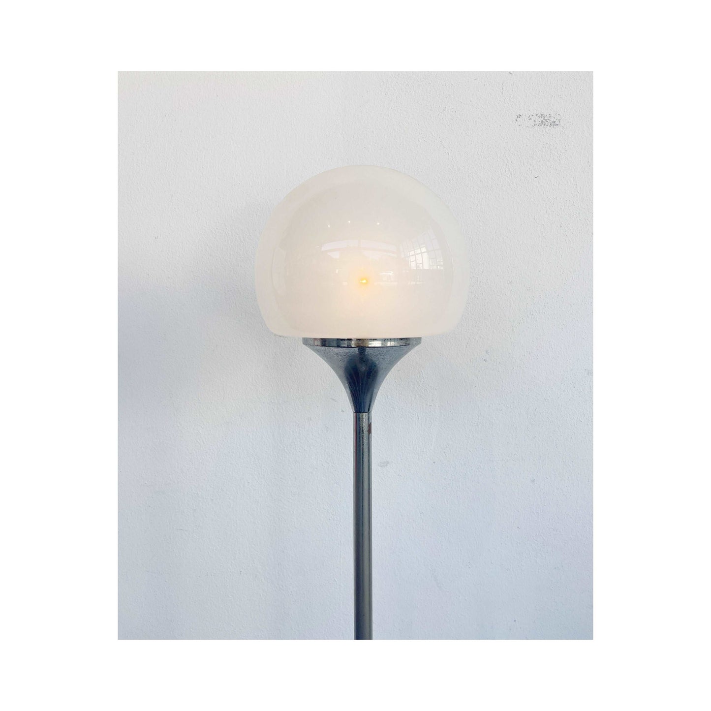 Piantana,1970, struttura in metallo cromato, lampada in vetro bianco