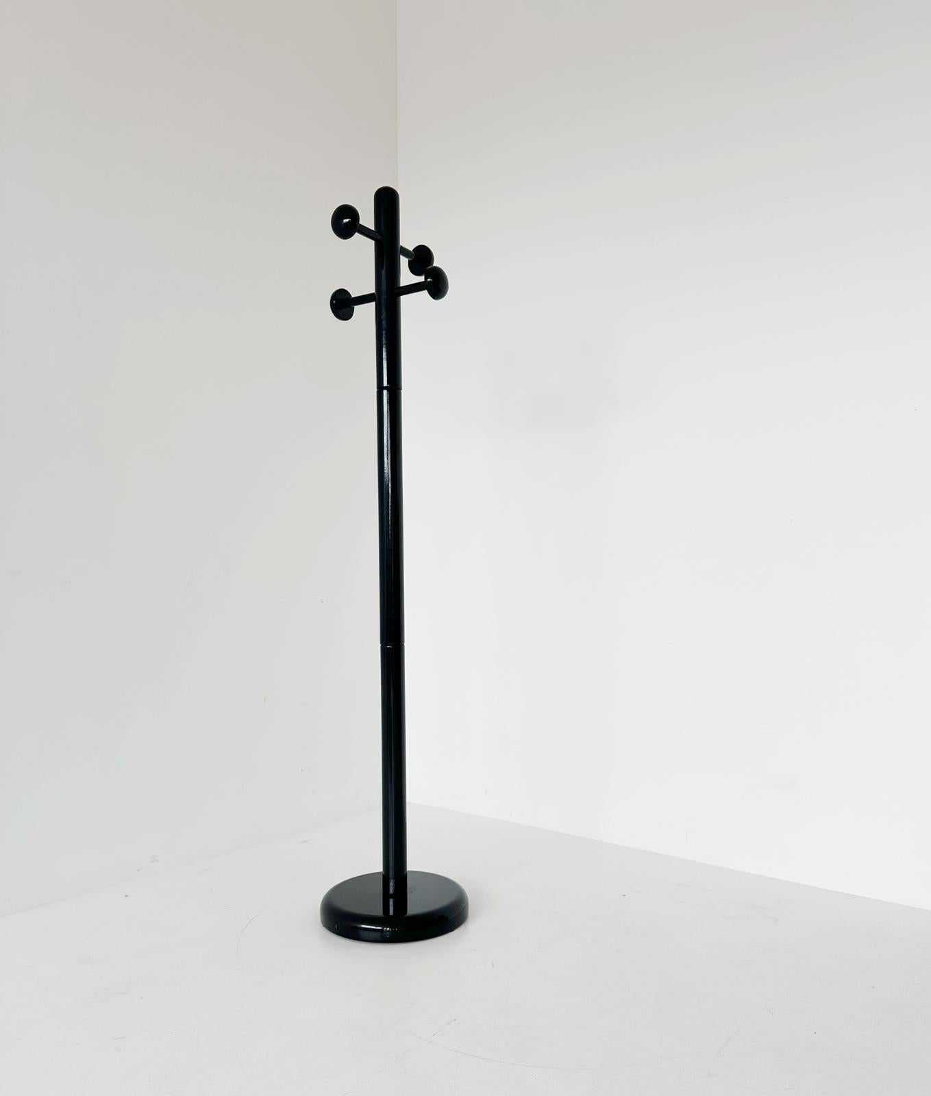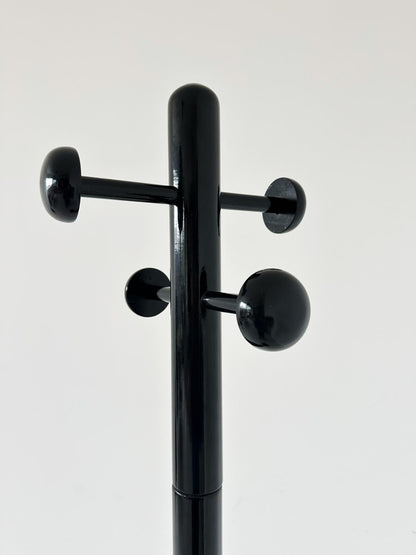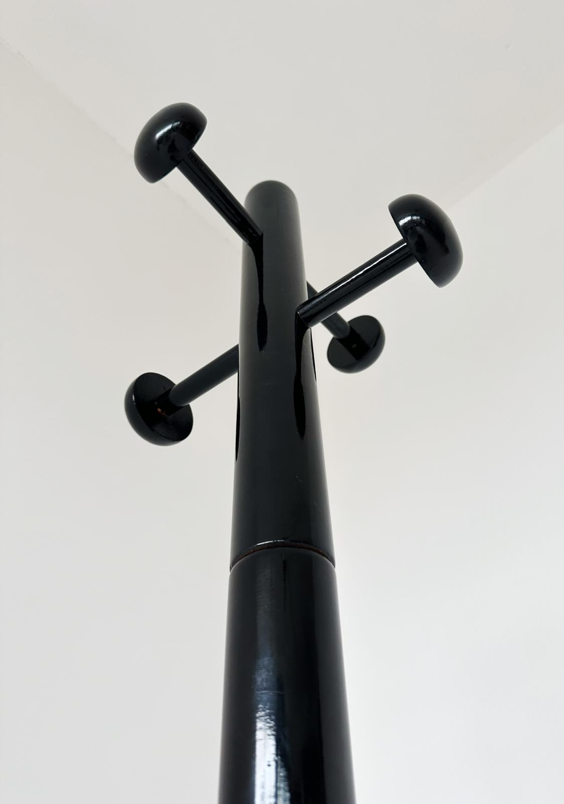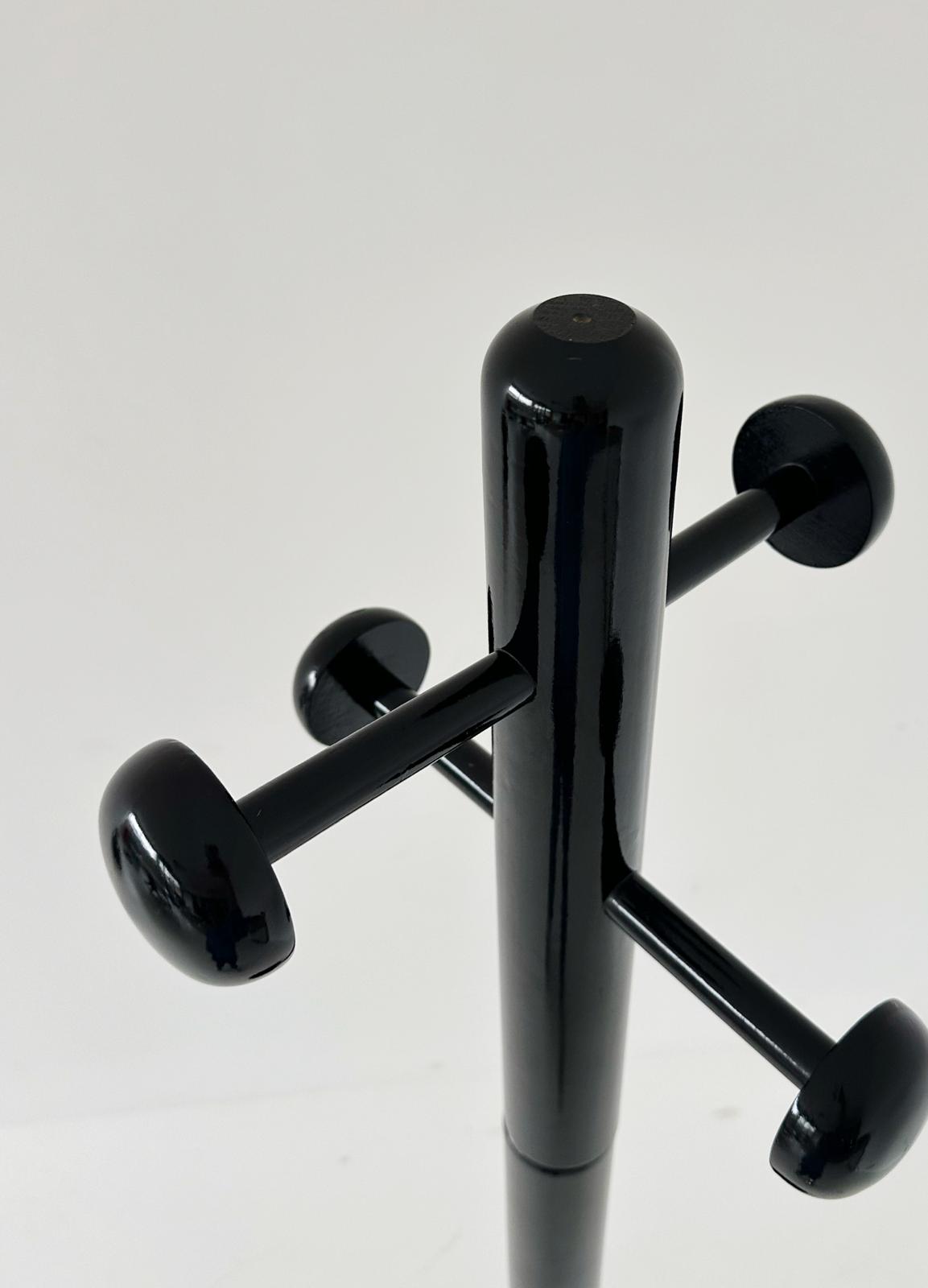 Si tratta di un appendiabiti dal design moderno e minimalista. Realizzato in legno nero e ha una struttura verticale con una base circolare stabile. L'appendiabiti è dotato di ganci sferici, disposti su due livelli, simmetricamente lungo la sommità del palo centrale. Questi ganci permettono di appendere in modo ordinato diversi capi di abbigliamento o accessori.