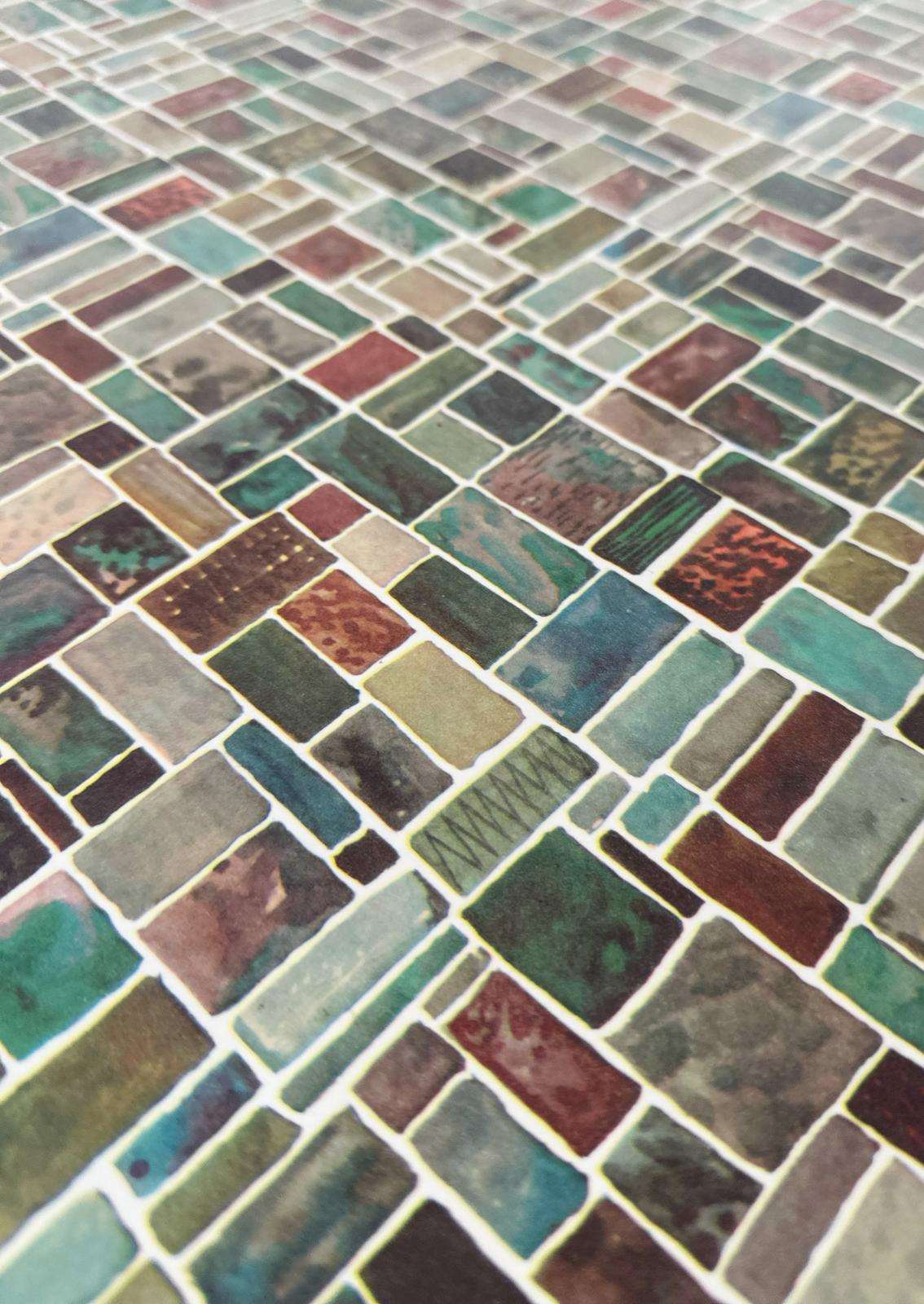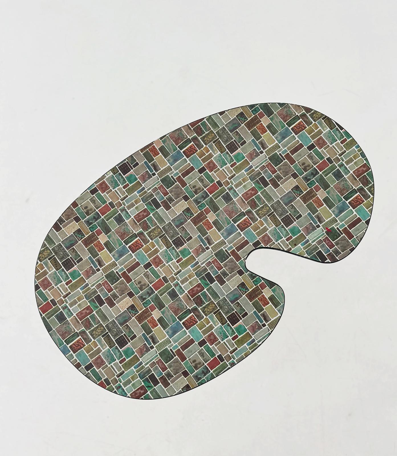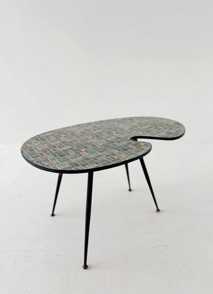 Questo tavolino degli anni ‘60 presenta un design distintivo, tipico dell’estetica moderna di metà secolo. La sua forma organica ricorda una tavolozza da pittore, con una superficie asimmetrica e morbida. Il piano è decorato con un mosaico di piastrelle quadrate di diversi colori, prevalentemente tonalità neutre come grigio, verde e marrone, che creano un effetto geometrico elegante. Le gambe sottili e affusolate, probabilmente in metallo nero, sono un classico del design minimalista di quel periodo, conferendo leggerezza e slancio alla struttura. Questo tipo di pezzo è caratteristico di un’epoca in cui si cercava di combinare funzionalità e stile innovativo.