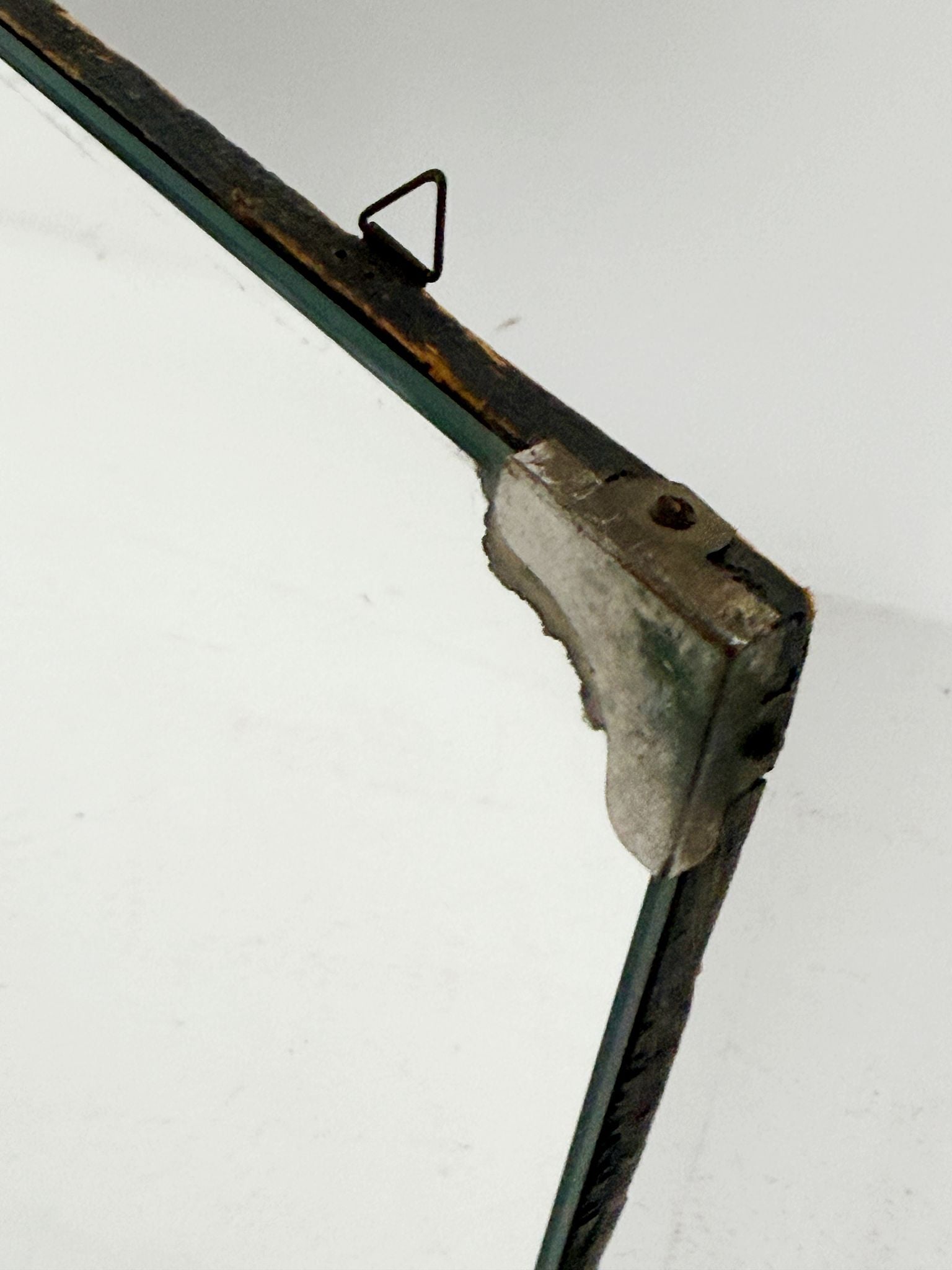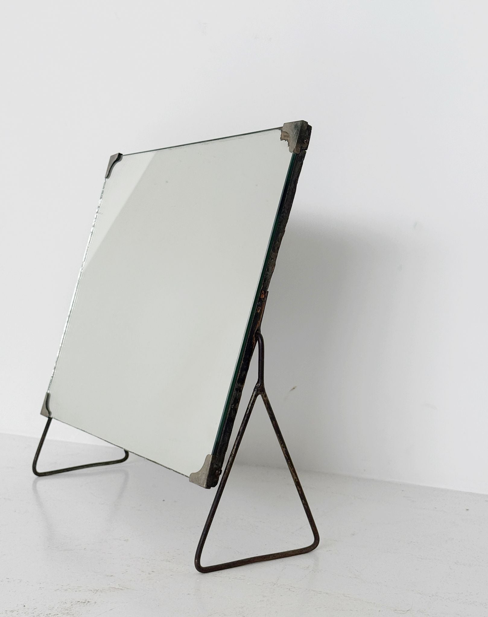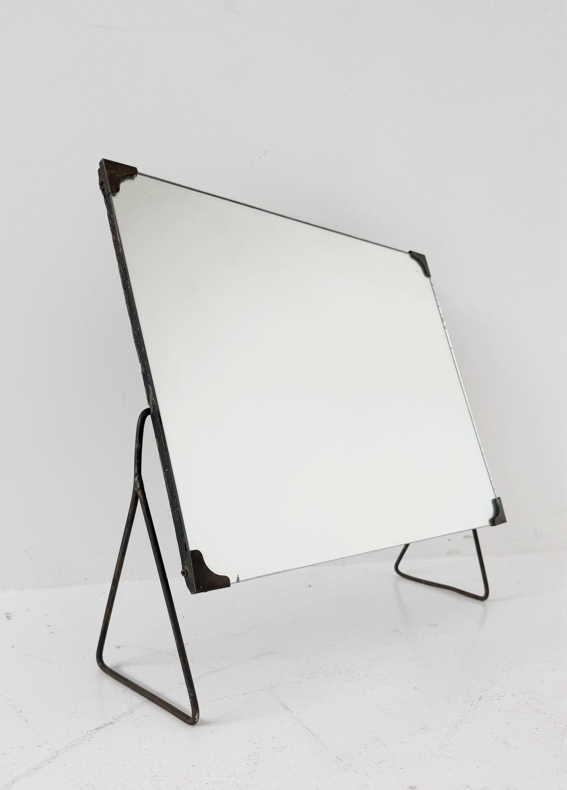 Lo specchio è bloccato frontalmente tramite fermi angolari metallici applicati sui quattro spigoli, soluzione tipica della produzione funzionale di metà Novecento.