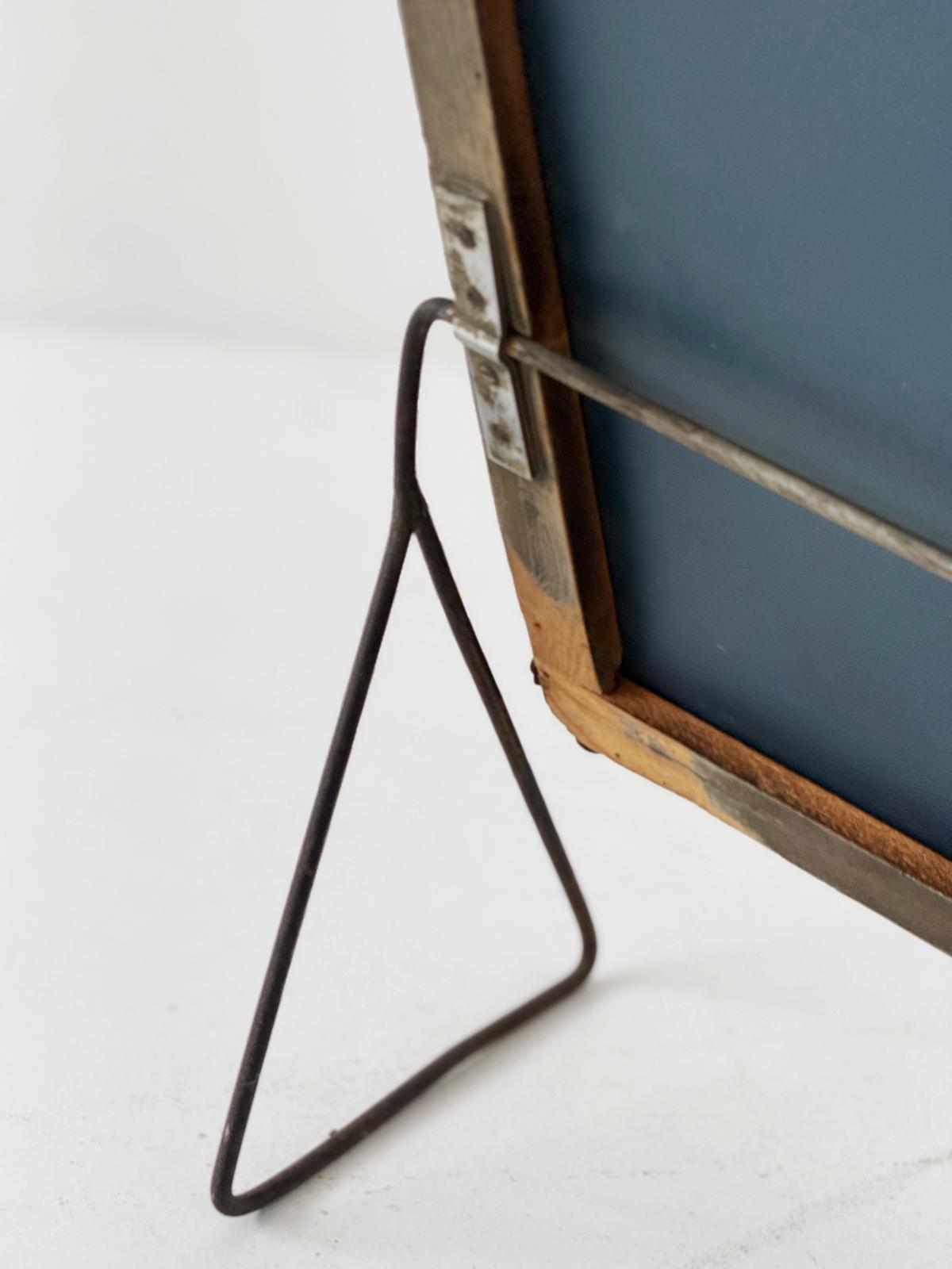 Coppia di specchi rettangolari da appoggio, ciascuno montato su una struttura posteriore in legno con cavalletto pieghevole in tondino di ferro.