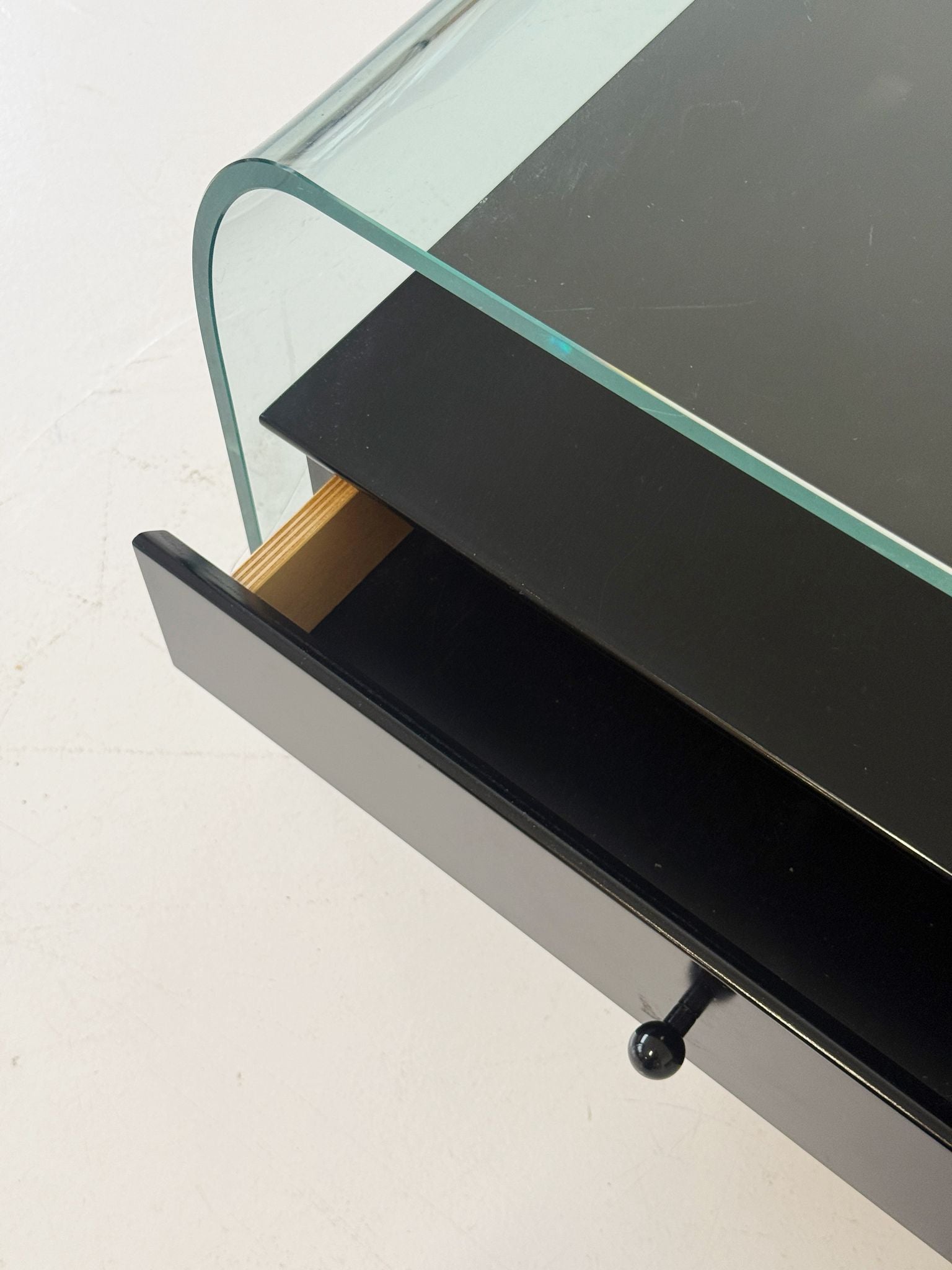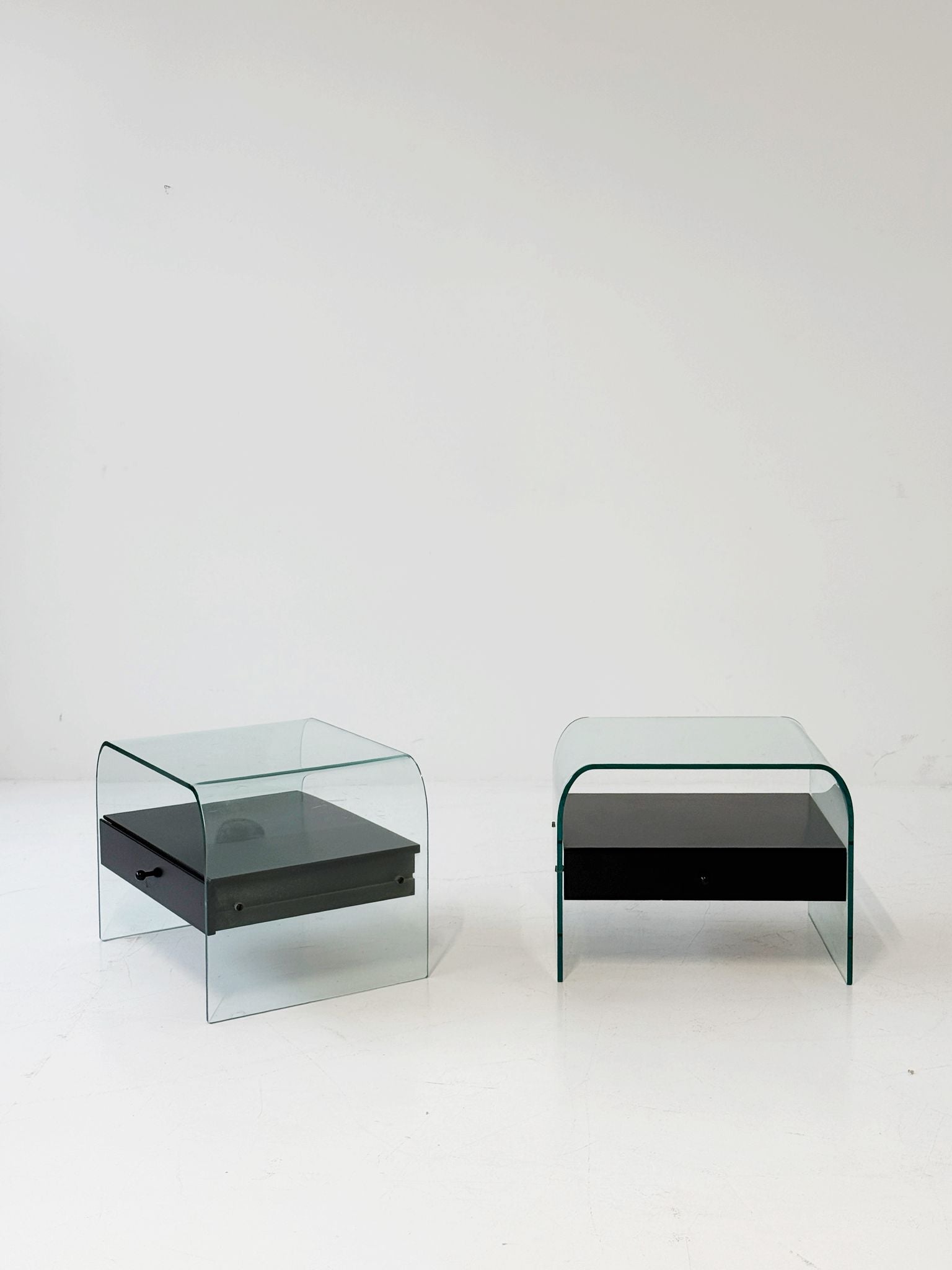 Coppia di tavolini in vetro curvato con cassettiera nera