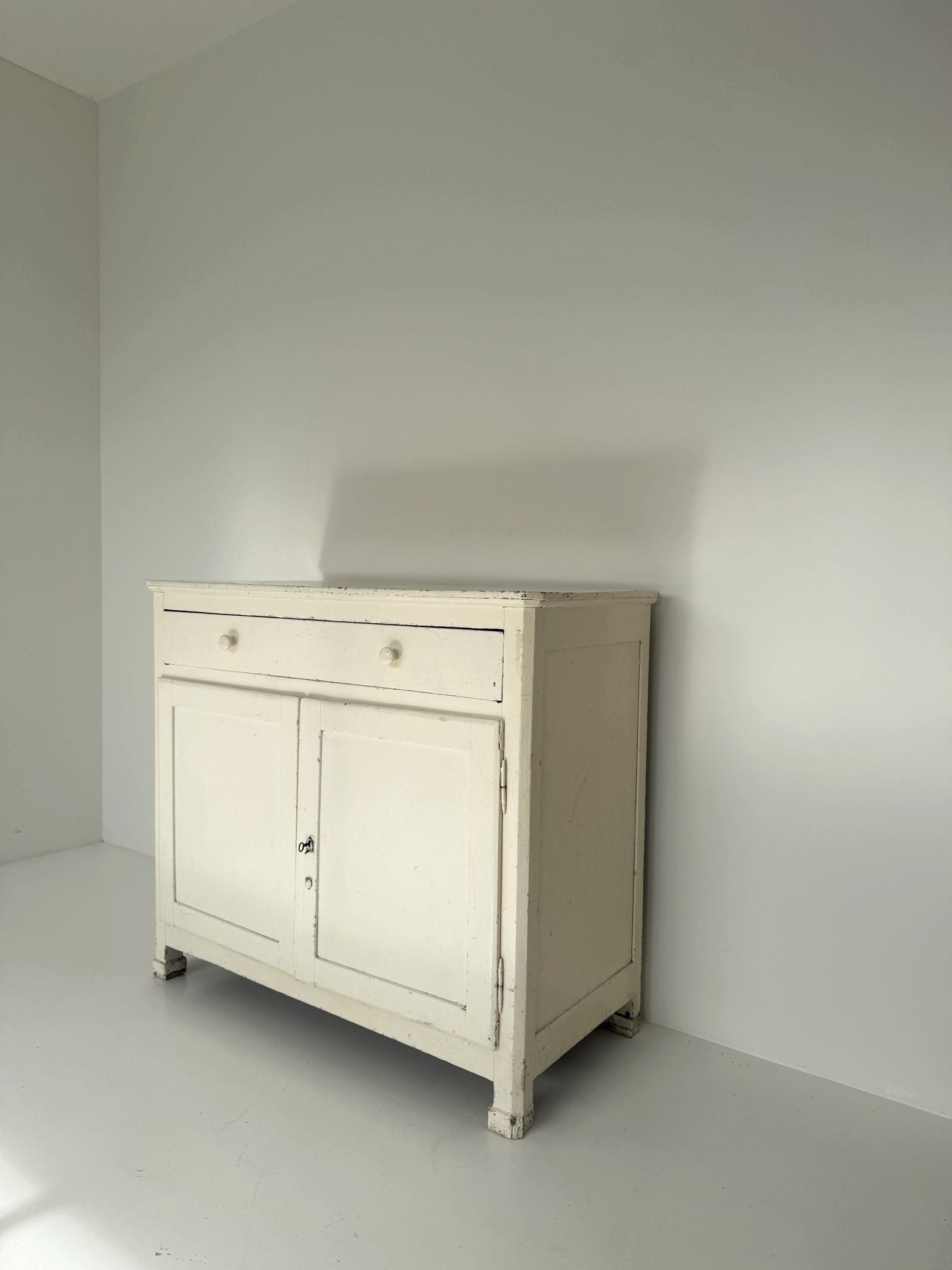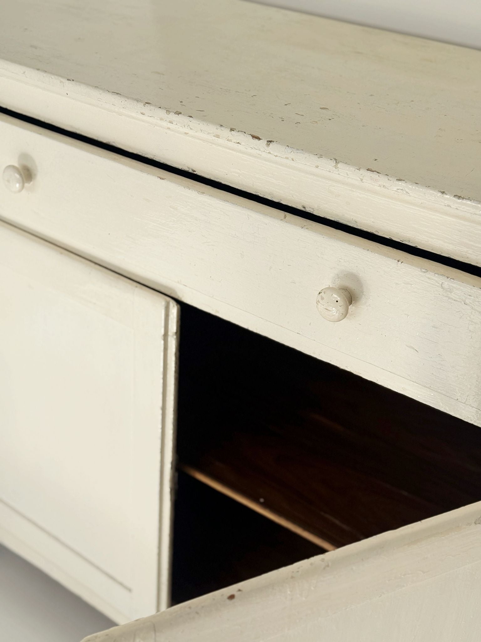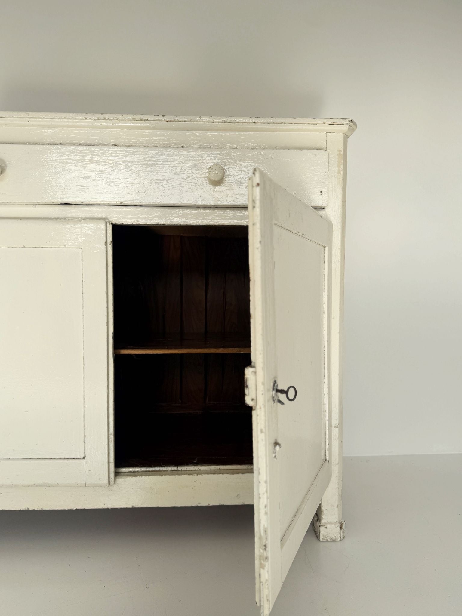 Realizzata in legno massello e dipinta di bianco, questa credenza porta con sé la leggerezza delle case di campagna e la calma delle cucine antiche. Le sue proporzioni compatte, il cassetto alto e le due ante con pomelli torniti la rendono insieme funzionale e discreta, capace di adattarsi ovunque.