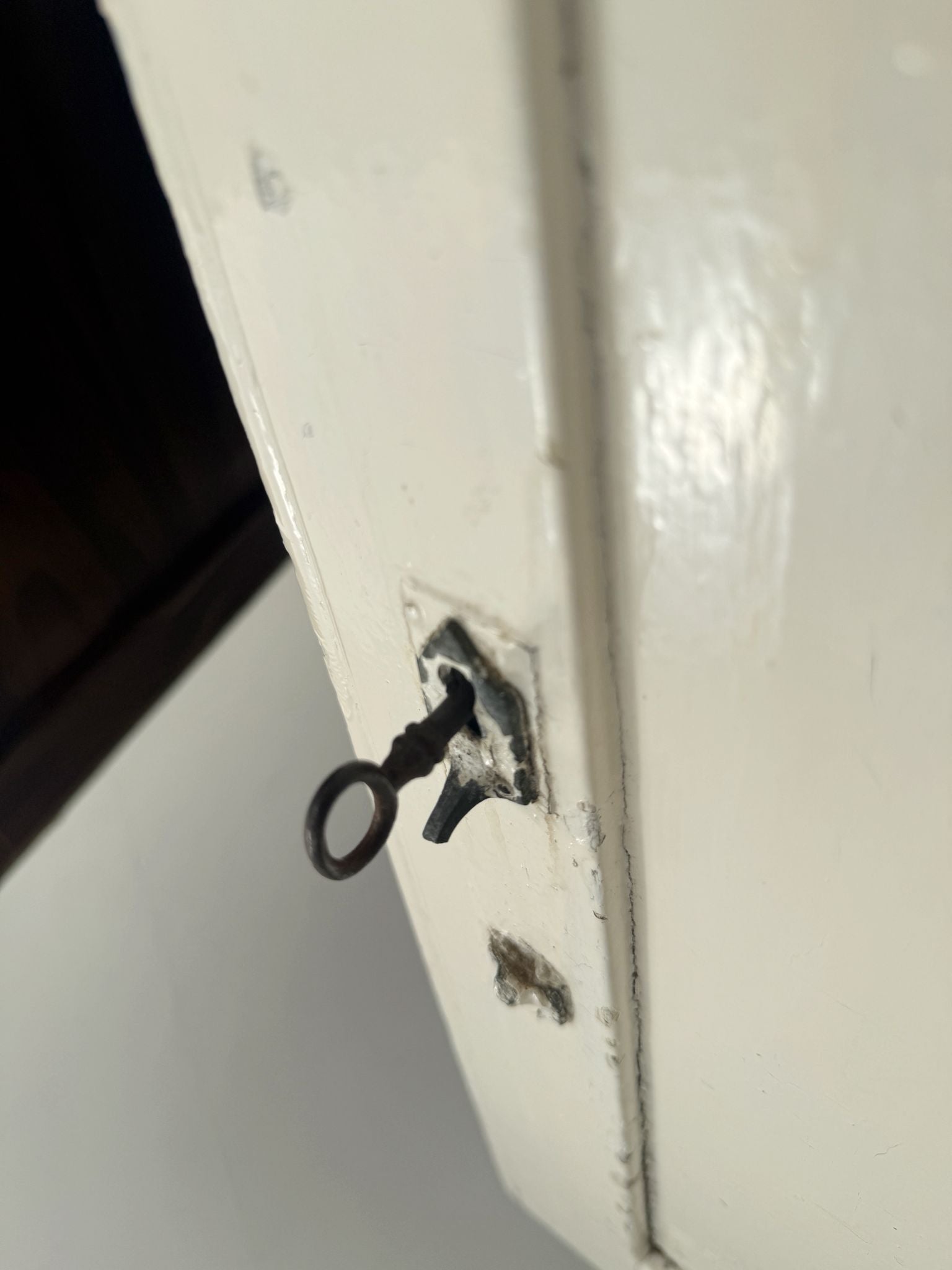 La vernice, consumata in alcuni punti, racconta una vita vissuta senza fretta. All’interno, un ripiano in legno scuro divide lo spazio: essenziale, onesto, domestico.