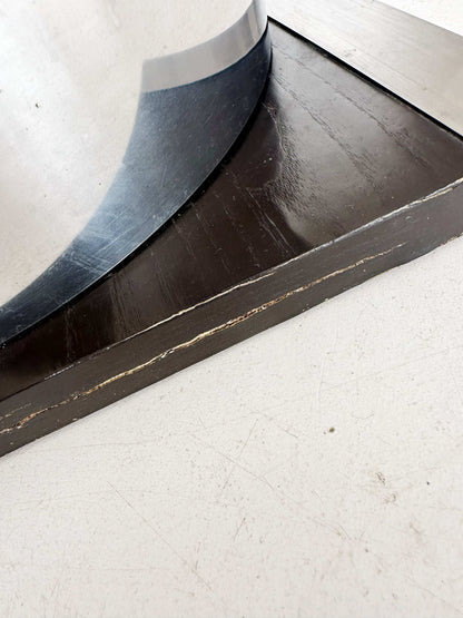 La struttura composta da due cilindri in acciaio curvato e lucidato poggia su una base in legno.