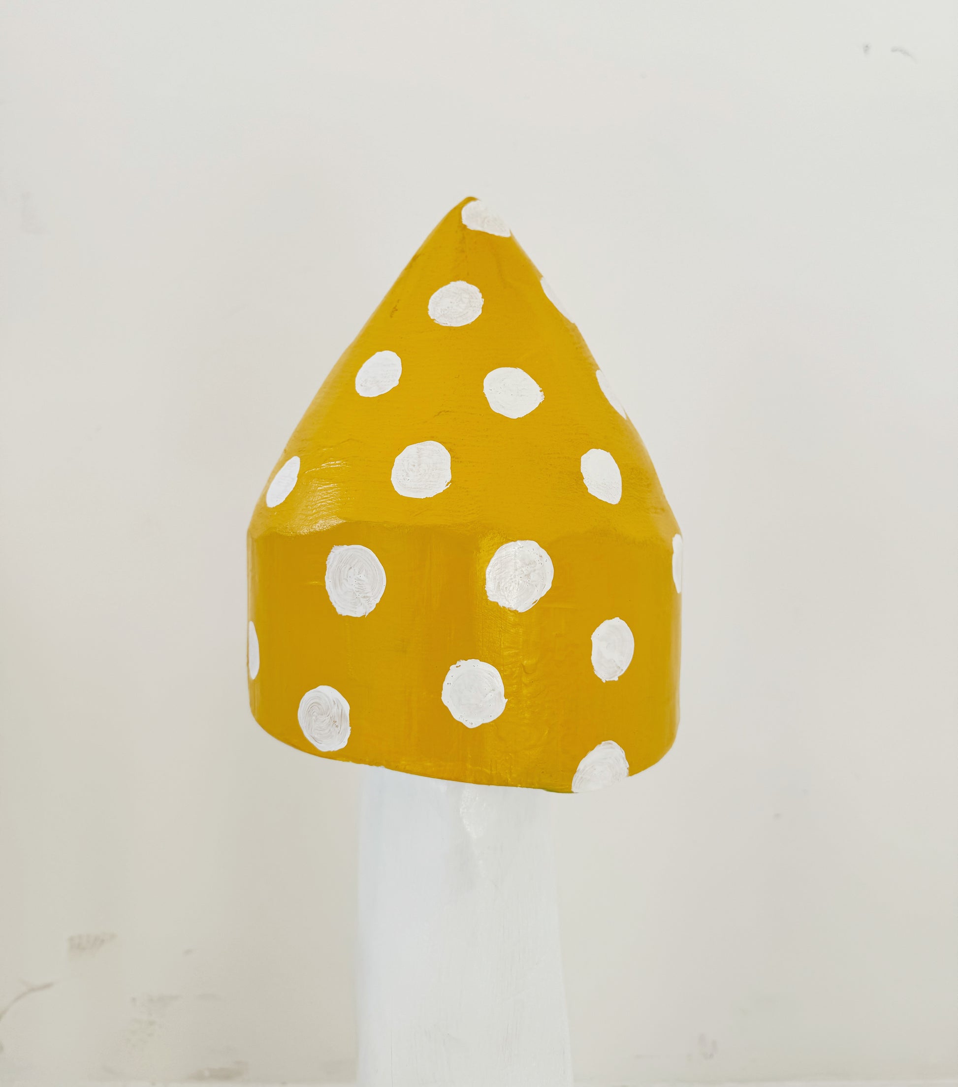 Il tappo, dipinto in un giallo intenso con pois bianchi, evoca l'immaginario fiabesco del sottobosco appenninico ed è rifinito con vernici specifiche per legno, mentre l'intera scultura è trattata con una vernice protettiva per esterni, che la rende adatta a spazi esterni riparati come giardini, terrazze o verande.
